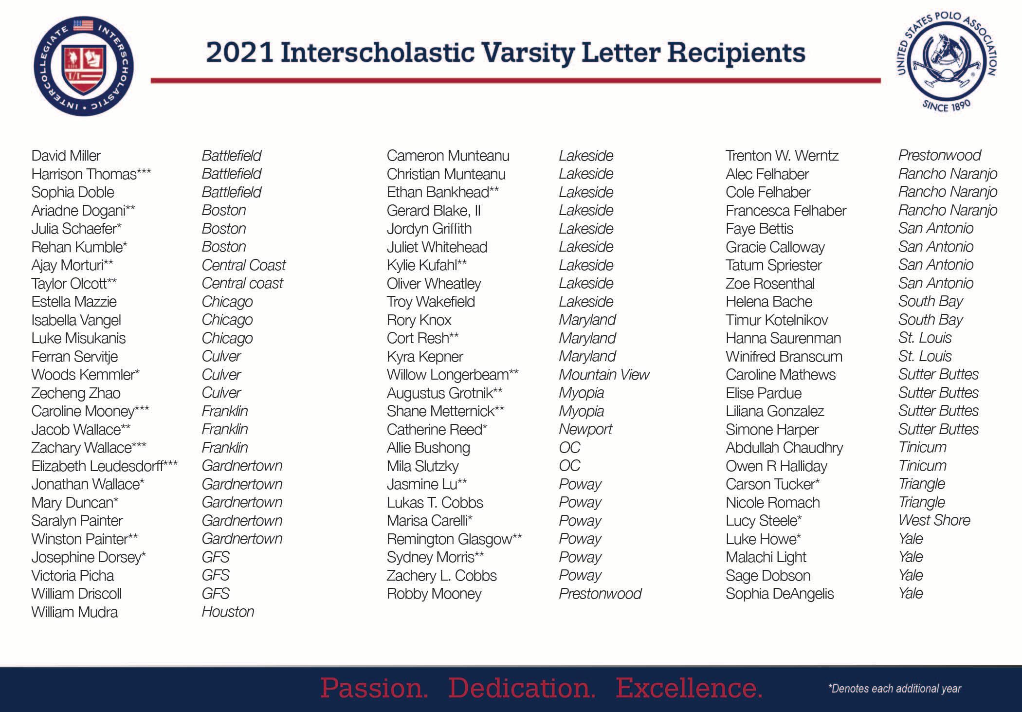 Congratulations to the 74 players who received their Interscholastic Varsity Letter for the 2020-2021 season! Players worked towards receiving their varsity letters by competing in tournaments and games, practicing and riding.