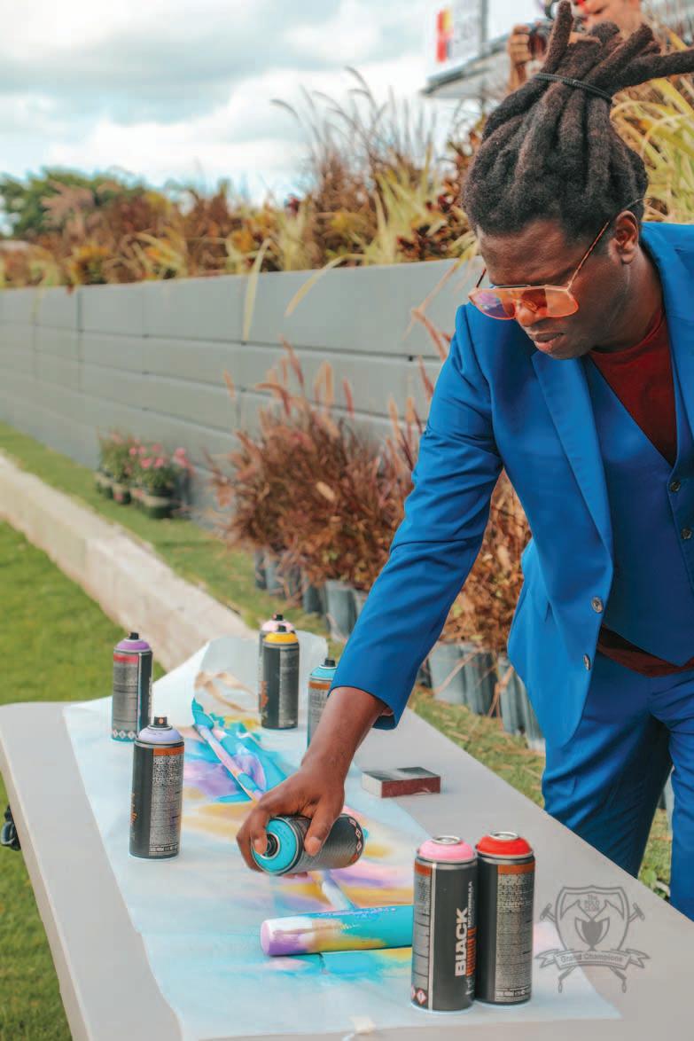 Far left: deejay Michael London Left: Artist Bradley Theodore paints a mallet to be auctioned off.