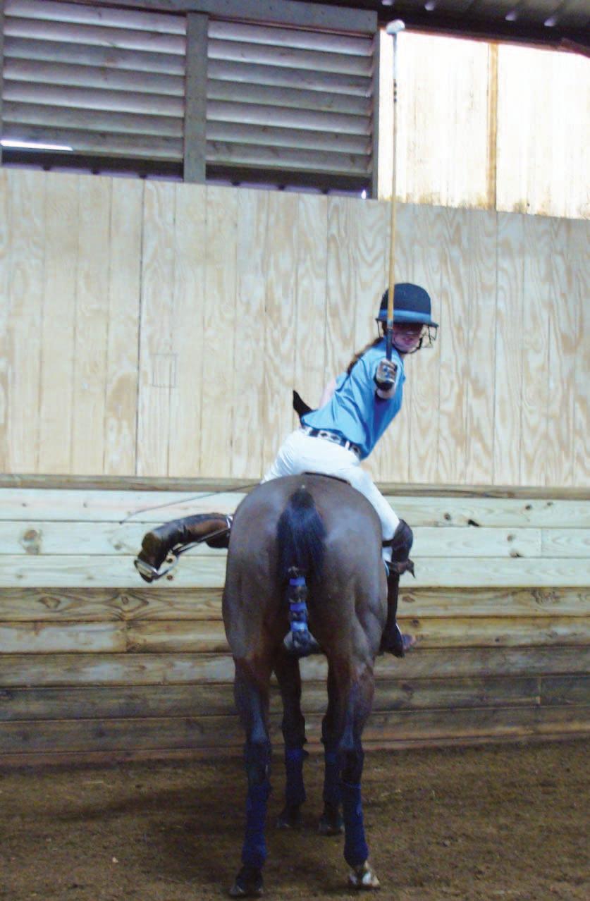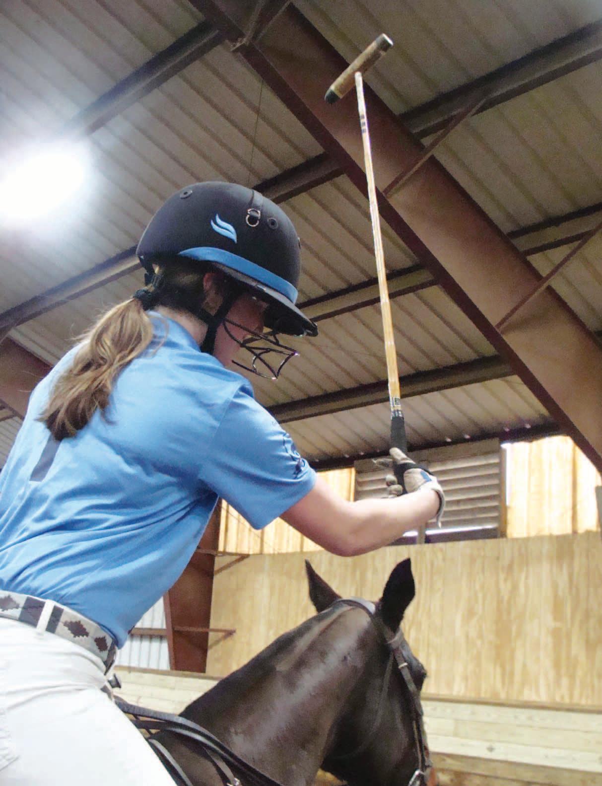 is starting the stroke with the mallet hand close to the horse’s ears obviously this makes it impossible to move the mallet in a straight line.) As you start to put more weight to the right keep your rein hand centered or even to the left to keep the horse straight. Keep the heel of the mallet head towards the ground at the height of the stroke initiation.
