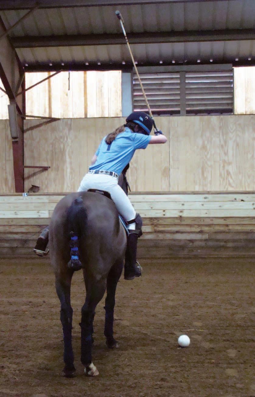 Everything in polo starts with your position in the saddle. In order to hit properly, you need to ride properly. The polo seat is a light seat with the grip on the thigh and knee, weight in the heels and torso slightly forward of vertical. Carry your mallet up with the handle somewhere between your chest and