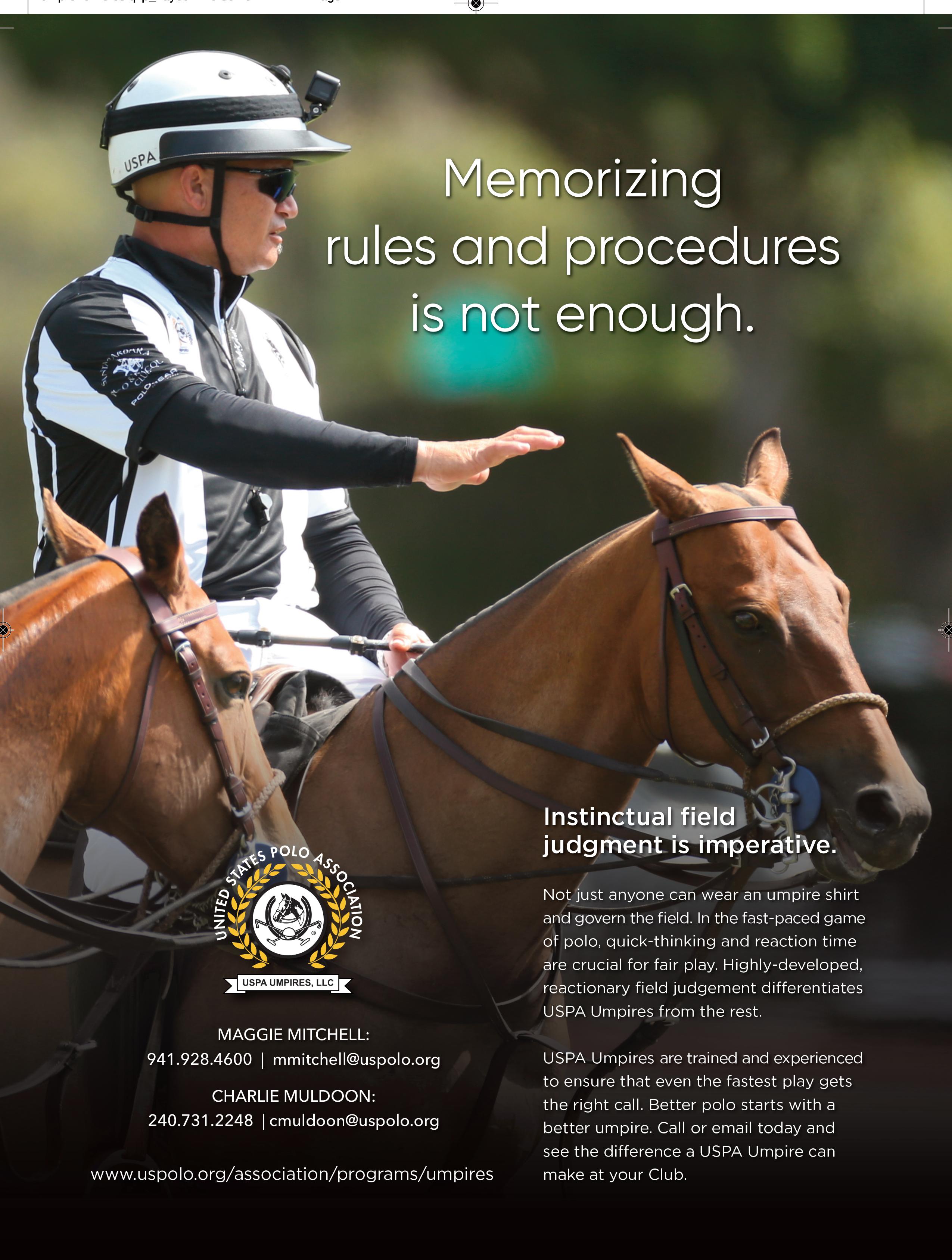 ©Copyright 2020 by United States Polo Association.. No part of this issue may be reproduced by any mechanical, photographic or electronic process without written permission of the publisher. Paul Brown illustrations are ©2018 and are reprinted by permission of Paul Brown Studios, Inc., P.O. Box 925, Hedgesville WV 25427. Subscription rates: $45/one year, $78/two years. Other countries (air mail), $78 drawn on U.S. bank/one year, $144 drawn on U.S. bank/two years. (GST:134989508). Subscription problems call (561) 968-5208.