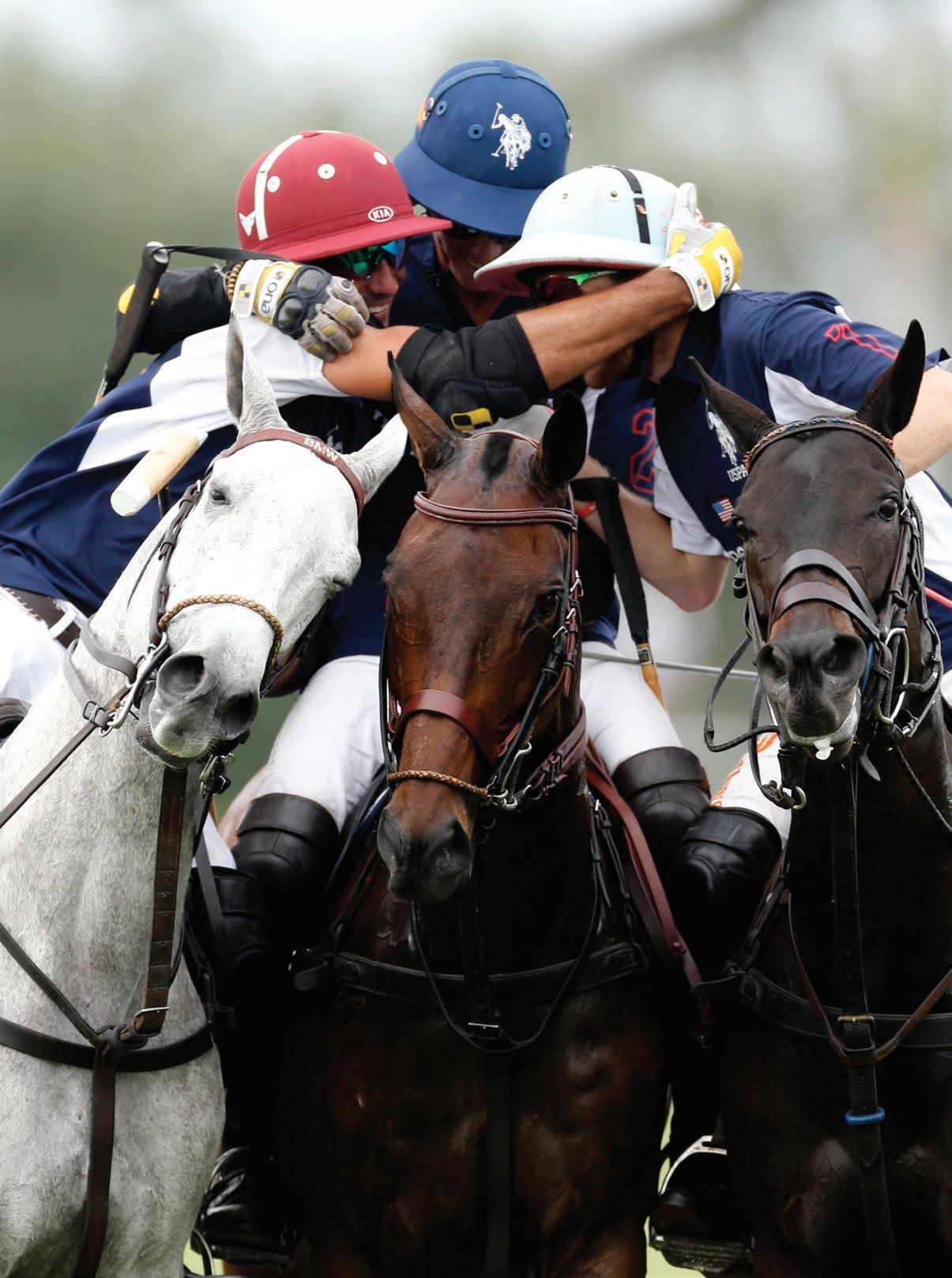 U.S. Polo Assn. teammates Alejandro Novillo Astrada, Juan Bollini and Grant Ganzi celebrate their win to qualify for the 2018 U.S. Open Polo Championship® Semifinals.