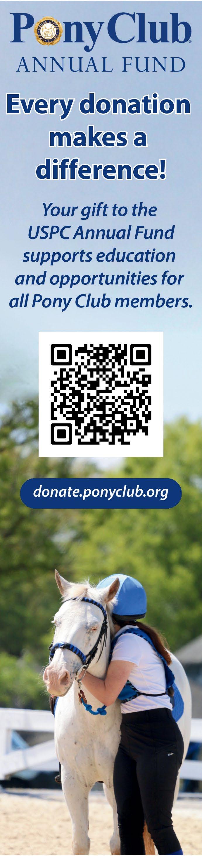 National dues for USPC membership cover only a portion of the actual cost to provide educational and leadership opportunities for one Pony Club member for one year. The Annual Fund closes that gap and allows USPC to be stronger and more vibrant. The generosity of the many donors who support the Annual Fund throughout the year make our success possible—we thank you. It is your dedication to our mission that gives our members experiences that enhance their lives long beyond their Pony Club days. Everyone—parents, members, leaders, grandparents, family, and friends—makes a difference and helps shape the larger Pony Club community to which we all belong. To donate, please visit https:// donate.ponyclub.org
