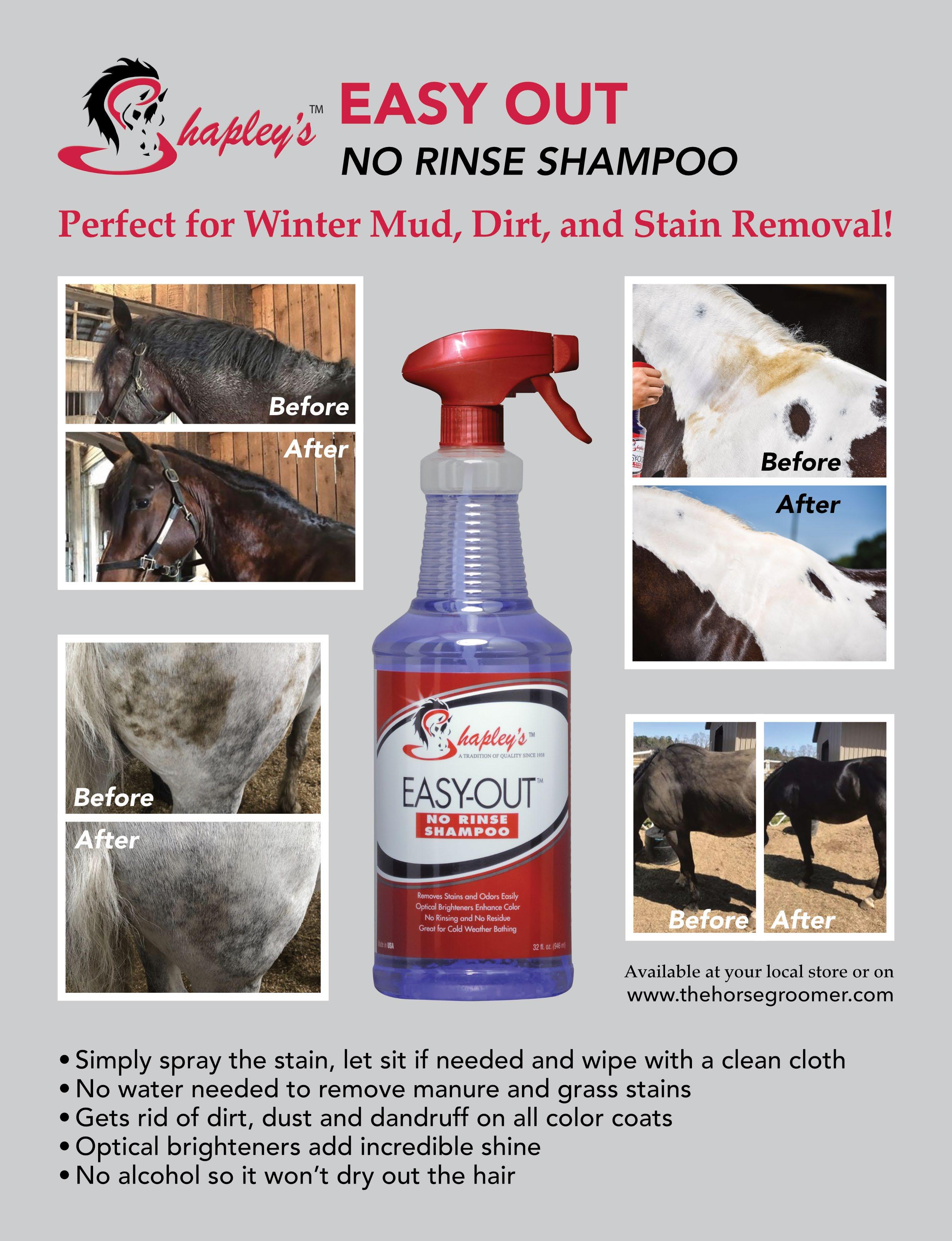 In warm weather, a nice bath with a mild shampoo will deep clean your horse. Look for products that boost shine, as these often have stain-repelling properties and leave the hair sleek. Slippery hair has a harder time holding onto mud.