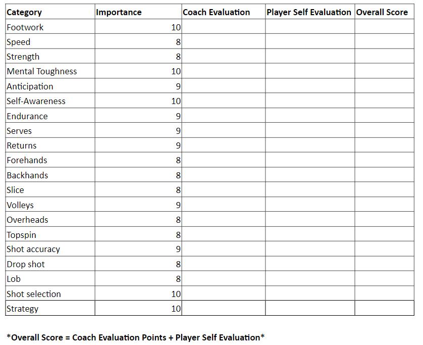 that include something as specific as their forehand, to something broader like their footwork. I recommend giving your players the evaluation first, followed by your assessment of each of category, and then you can total the numbers between the two for an overall player/coach score. Once the objectives