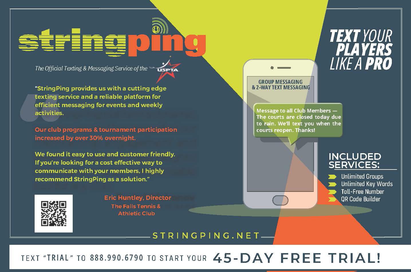 I would also like to say a personal thank you to Trish, the national board and our national staff. The first six months have flown by, and I am so proud to represent you. It has been amazing to meet so many of you at your divisional conferences, USTA sectional meetings, Indian Wells, the Miami Open, Del Rey Beach, Racquet X, The Directors Club, USTA AMC, The Billie Jean Cup and the USPTA Florida Central Division conference. Let’s keep it rolling together—I mean, united!*