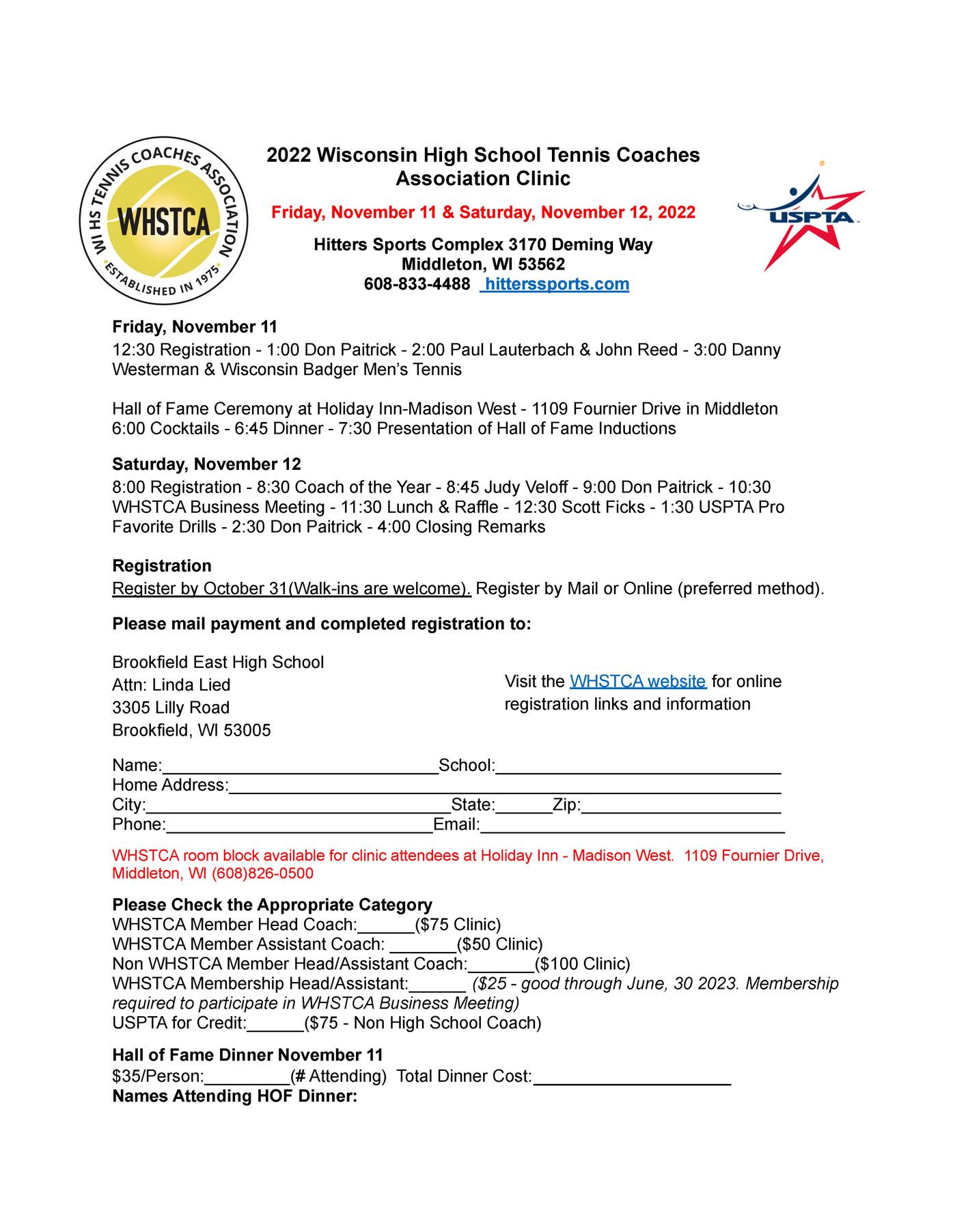 12th Wisconsin High School Tennis Coaches Clinic, Hitters Sportsplex in Middleton, WI , 2:00 6:00 pm