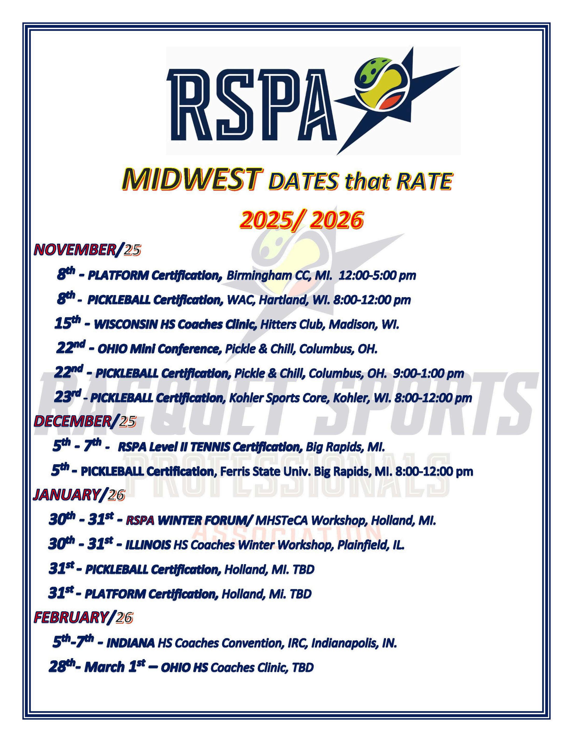 With finishing out the year, what are you doing as a professional to take yourself to the next level? As an RSPA Midwest Board, we currently have 4 members who have 3 plus racquet sports certifications. I challenge you to expand your horizons and look to add another racquets certification to your resume I’d also challenge you to reach out to your fellow instructors who were former USPTA/RSPA members or who have never been certified to start the process We have a lot of momentum and want to see every racquet sports instructor certified I feel we owe that to our clubs and members Look to Rebrand You and take your game to the next level into 2026 Let’s finish out the year strong and see you on the courts soon!