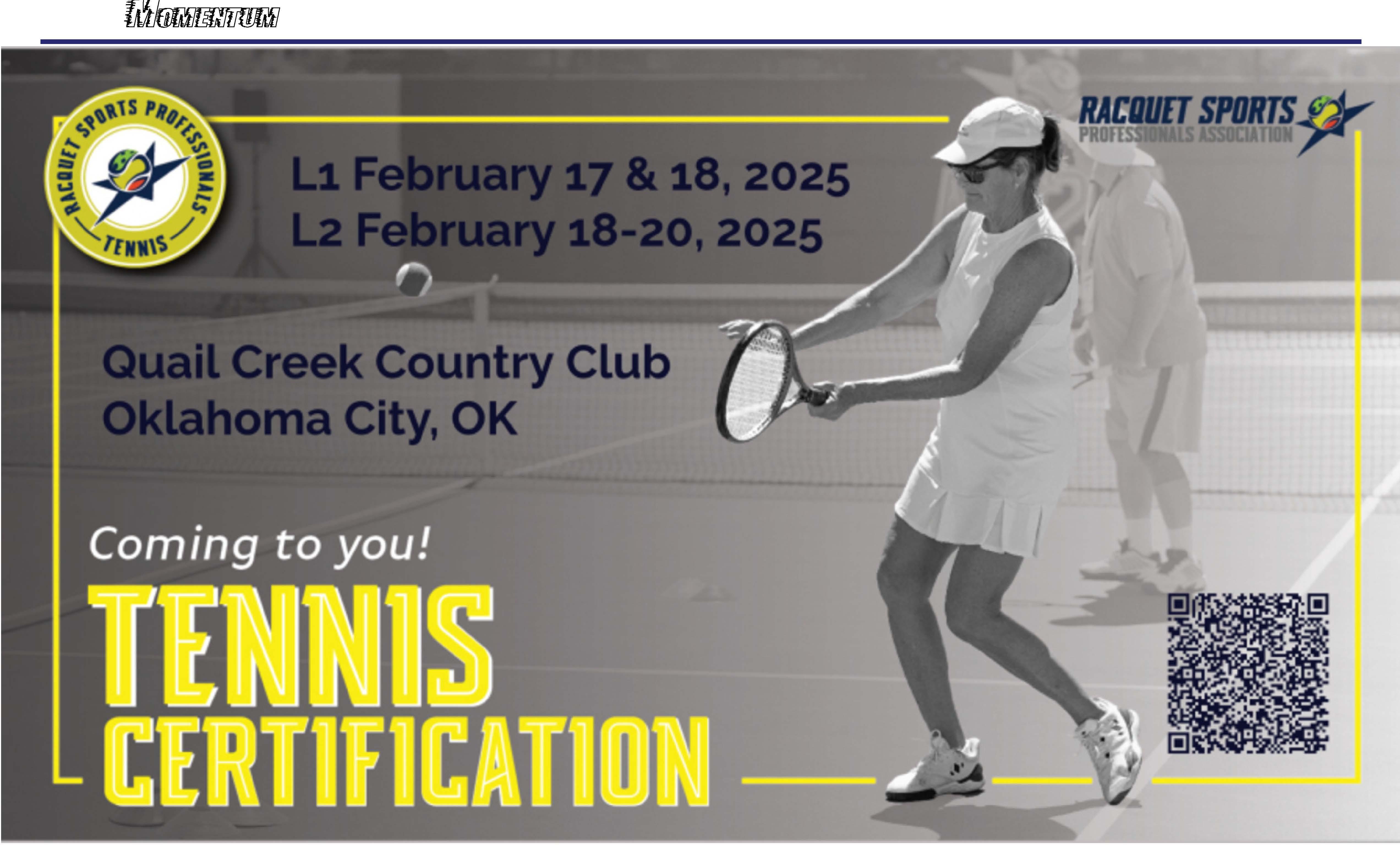 A great place to begin is at our Missouri Valley Conference, February 20–21, at Quail Creek Country Club in Oklahoma City. Our keynote speaker, Craig O’Shannessy, has been spending time “down under” at the Australian Open and will bring us the latest analytics and developments in the game. We also have several outstanding speakers presenting in the areas of coaching and teaching, leadership, operations, and careers. This is an excellent opportunity to earn education credits, network, and brainstorm with fellow racquet professionals. The knowledge you gain can be taken back to your facilities and shared with your teams and members.