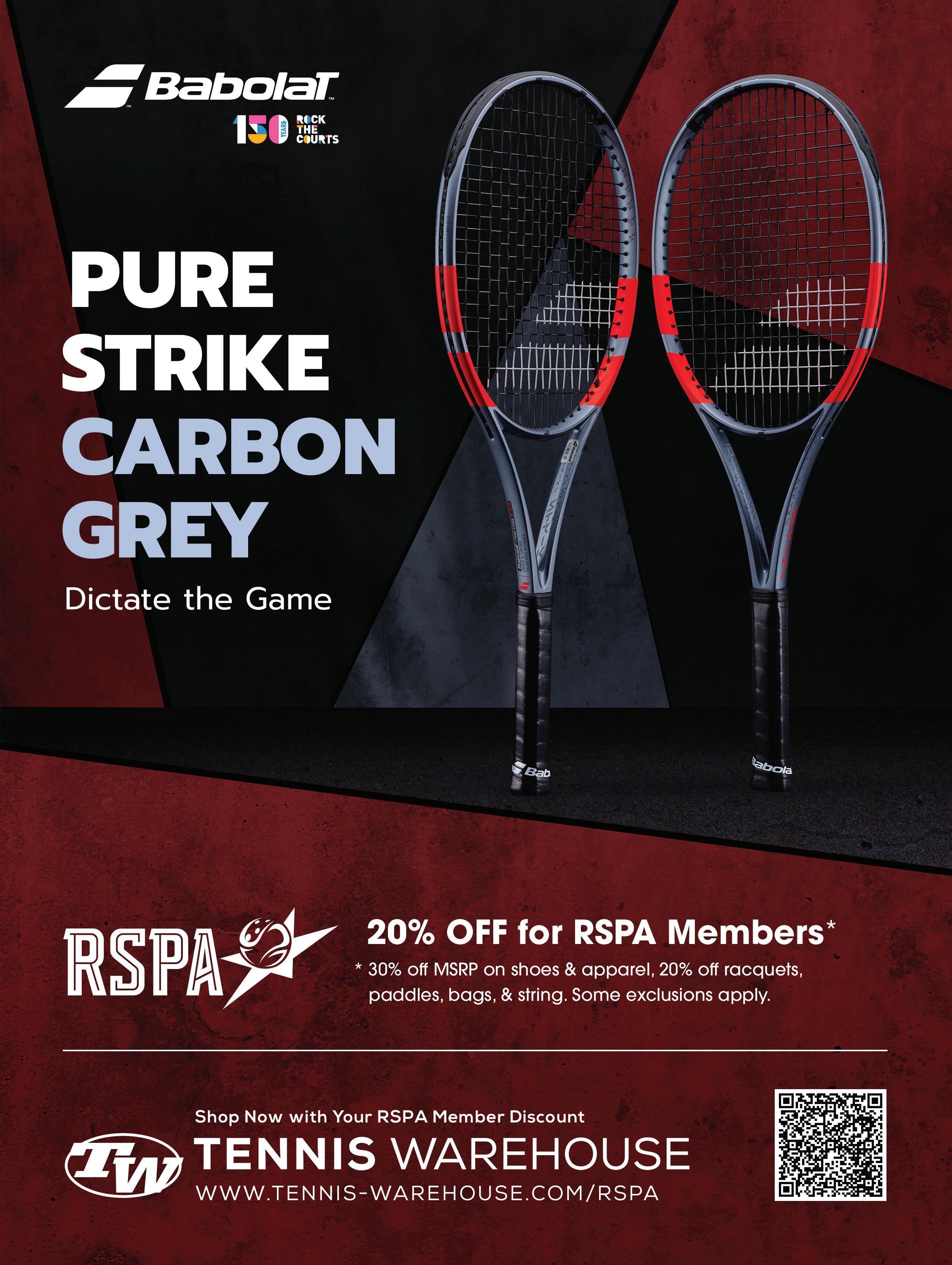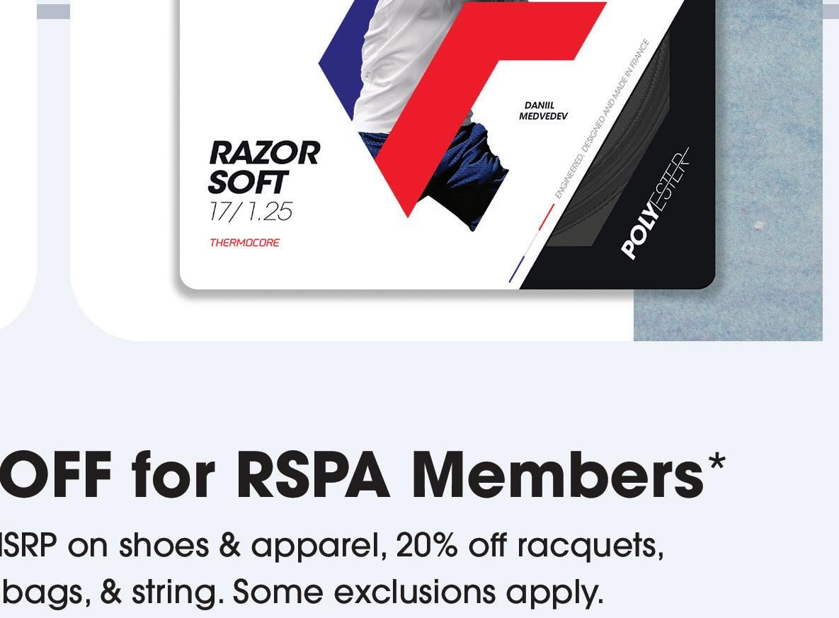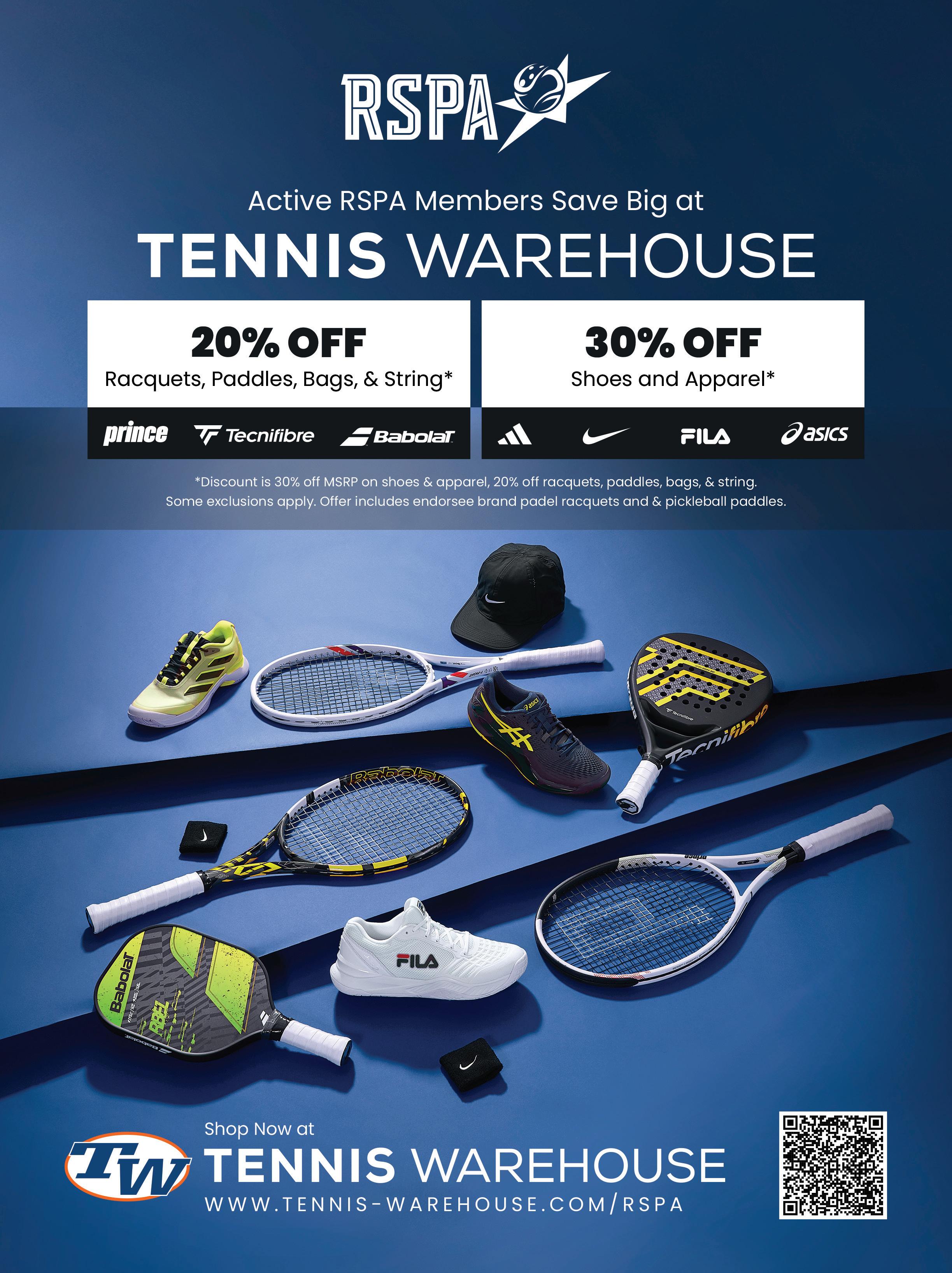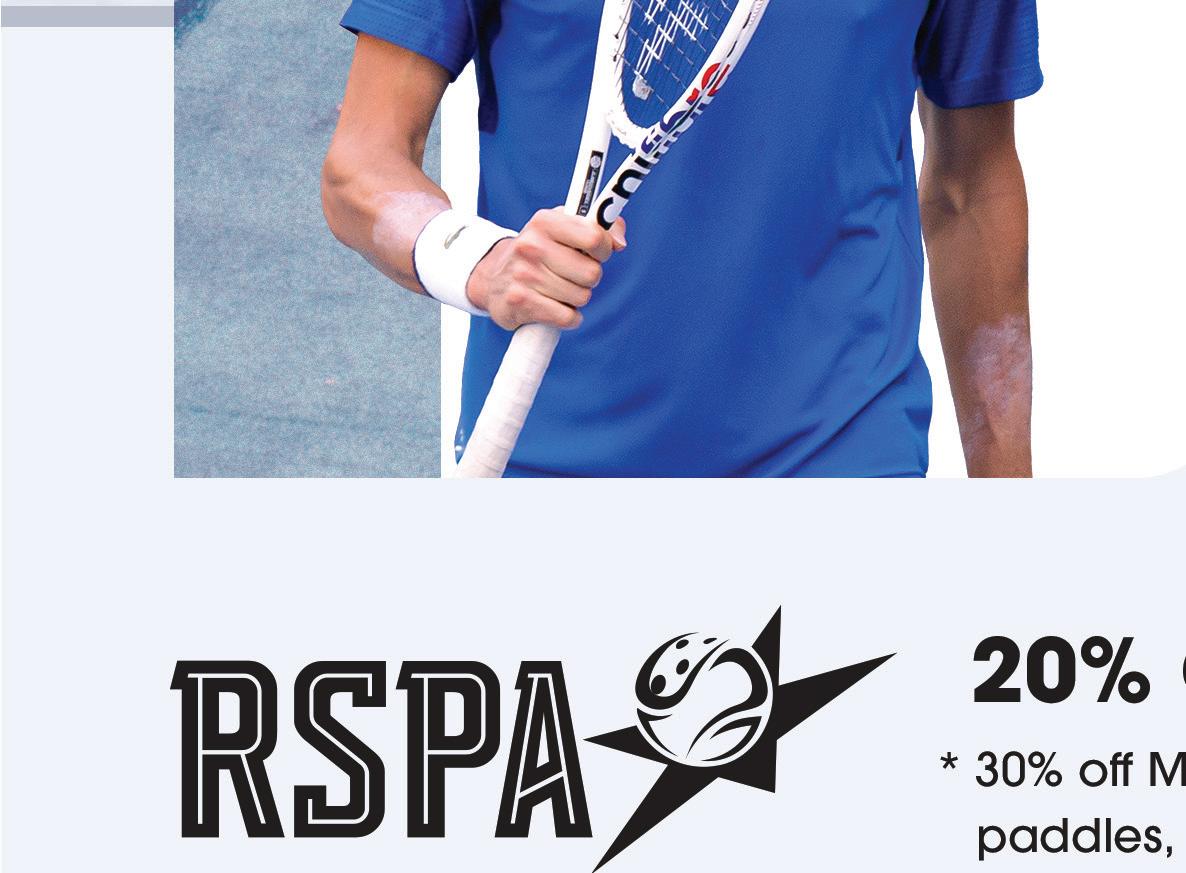 RSPA members: Your discount awaits. Visit www.PadelWarehouse. com to explore the full selection and take advantage of your exclusive savings today.