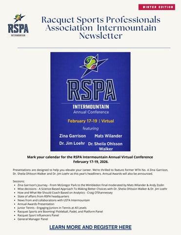 As you enjoy the amazing educational line-up we have this year, please challenge yourself and be curious. Ask questions. Dig in deeper. Challenge each other nicely and come with a mindset of continuous learning. The curation of the speakers this year is world class, and each session will provide you an opportunity to learn and grow. We have changed things up a bit this year with a balance of on-court and off-court sessions that include a great mix of tennis, pickleball, Padel and even hints of squash and platform.