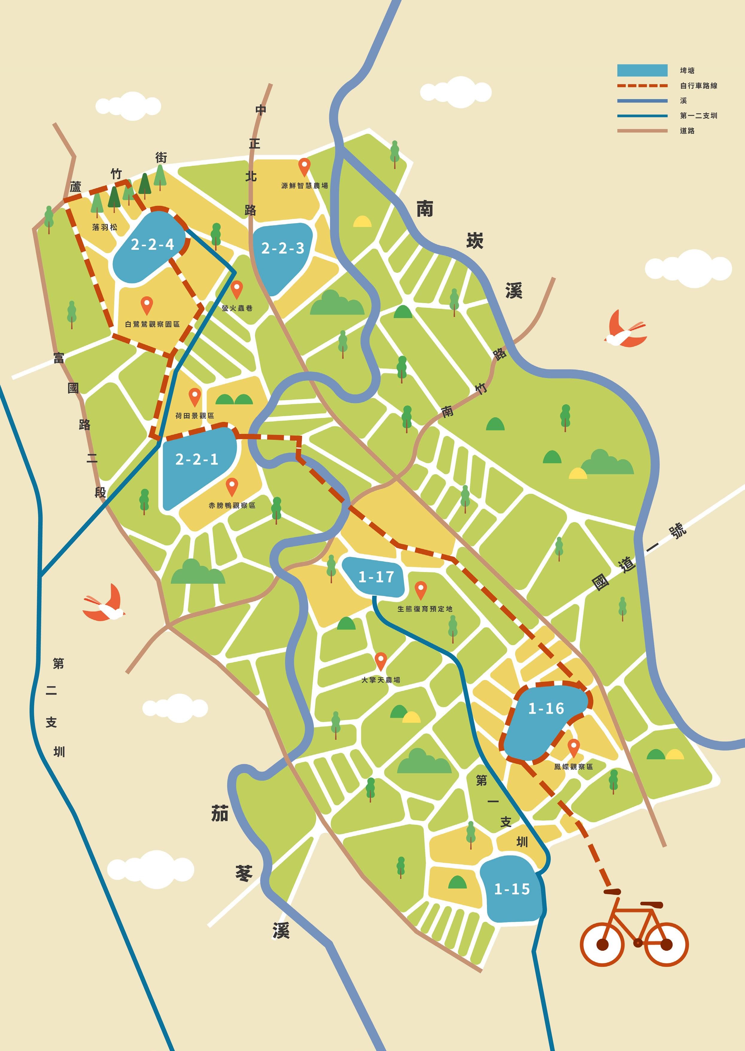 There are various big ponds in Taiwan, the area of these ponds are more and more big from hills to seacoast, and it formed a special human landscape. The Hakka call these big ponds was "Pi Tang" Hoklo call them "Pi Zai" . And the countless pond in Taoyuan plateau is the geographic landscape you will see when you enter the area of Taiwan and before landing in Taiwan Taoyuan International Airport. Because of that, it also is a landscape that symbols our country portal imagery.