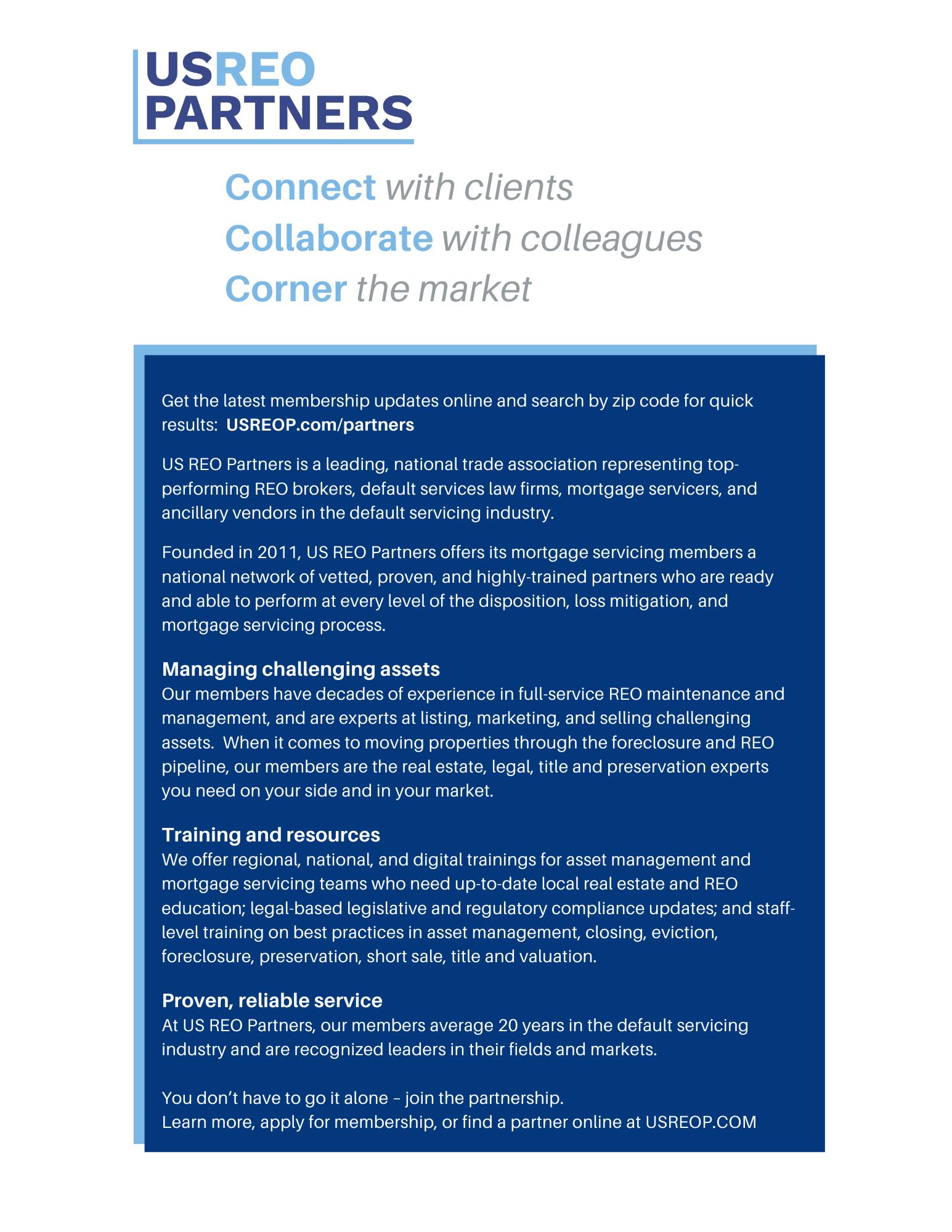 PRTNR Magazine is the official publication of US REO Partners. PRTNR is a digital publication published four times a year. PRTNR is focused on delivering cutting-edge pre- and post-foreclosure content crafted, created, and curated by US REO Partners’ clients, members, and invited authors. The magazine offers feature content covering, REO, legal, title, technology, and other default-related content that educates clients and promotes members.