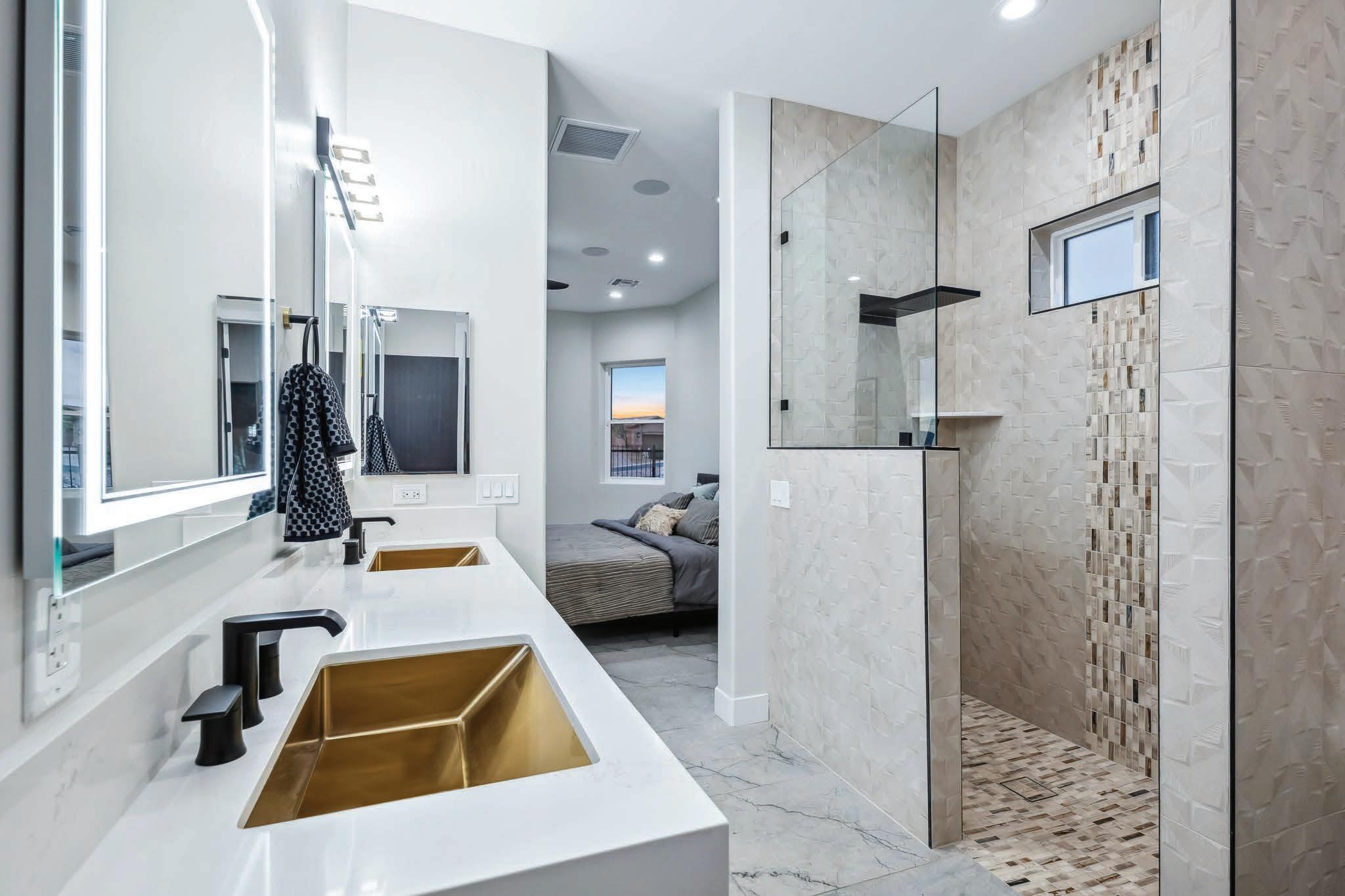 The gourmet kitchen is a showstopper—anchored by a massive quartz island with waterfall edges and stylish pendant lighting. Rich, dark cabinetry offers abundant storage, perfectly contrasted by brass hardware and under-cabinet LED lighting. Premium appliances, a pot filler, a walk-in pantry, and a built-in wine fridge elevate everyday cooking to chef-level luxury.