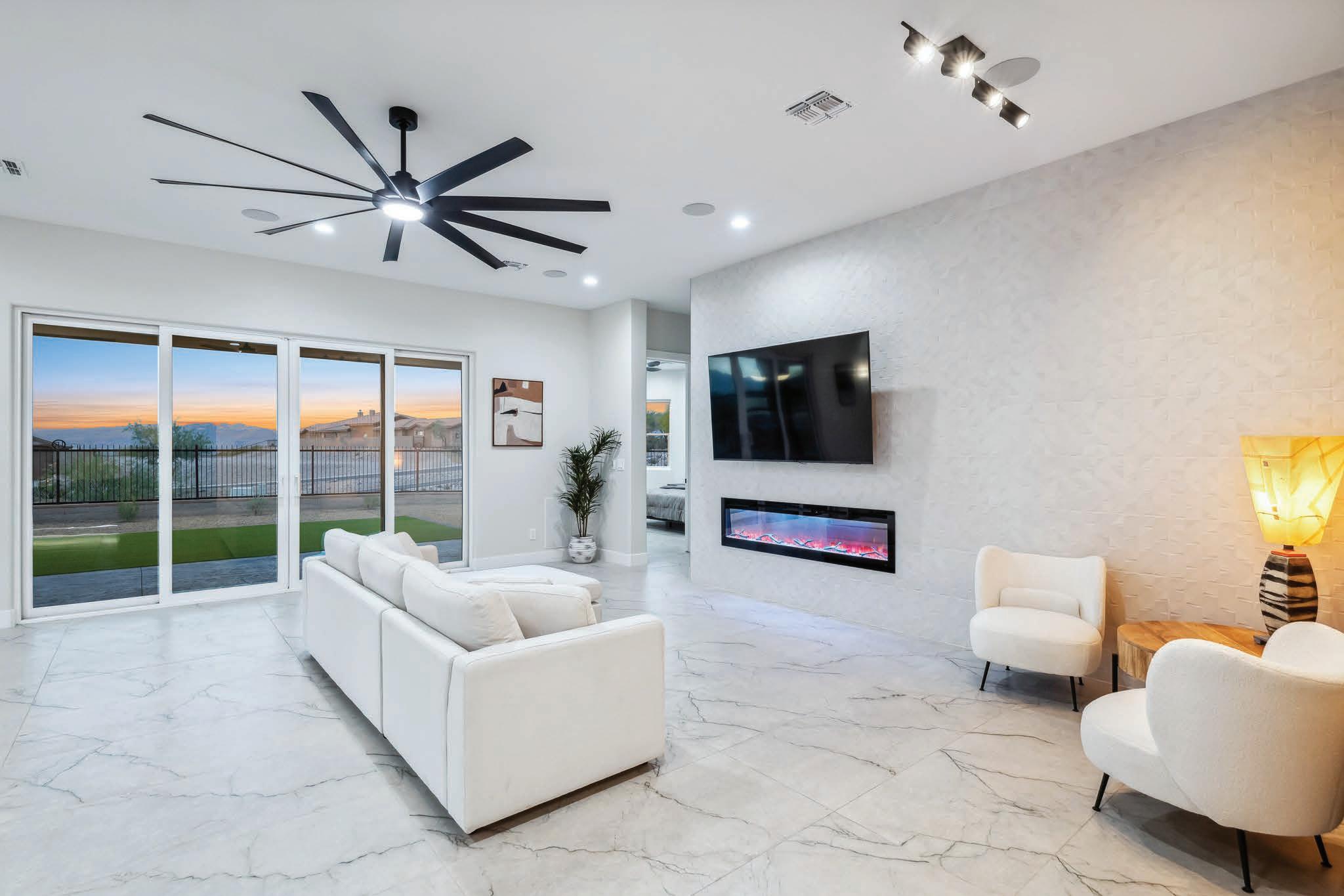 Step inside to discover expansive open-concept living, where soaring ceilings and designer finishes define each room. The living area features a textured accent wall with a sleek electric fireplace, a mounted flat-screen TV, and an oversized modern ceiling fan that makes a bold statement. Bright white interiors, large format tile floors, and artful lighting lend a gallery-like elegance to the space.