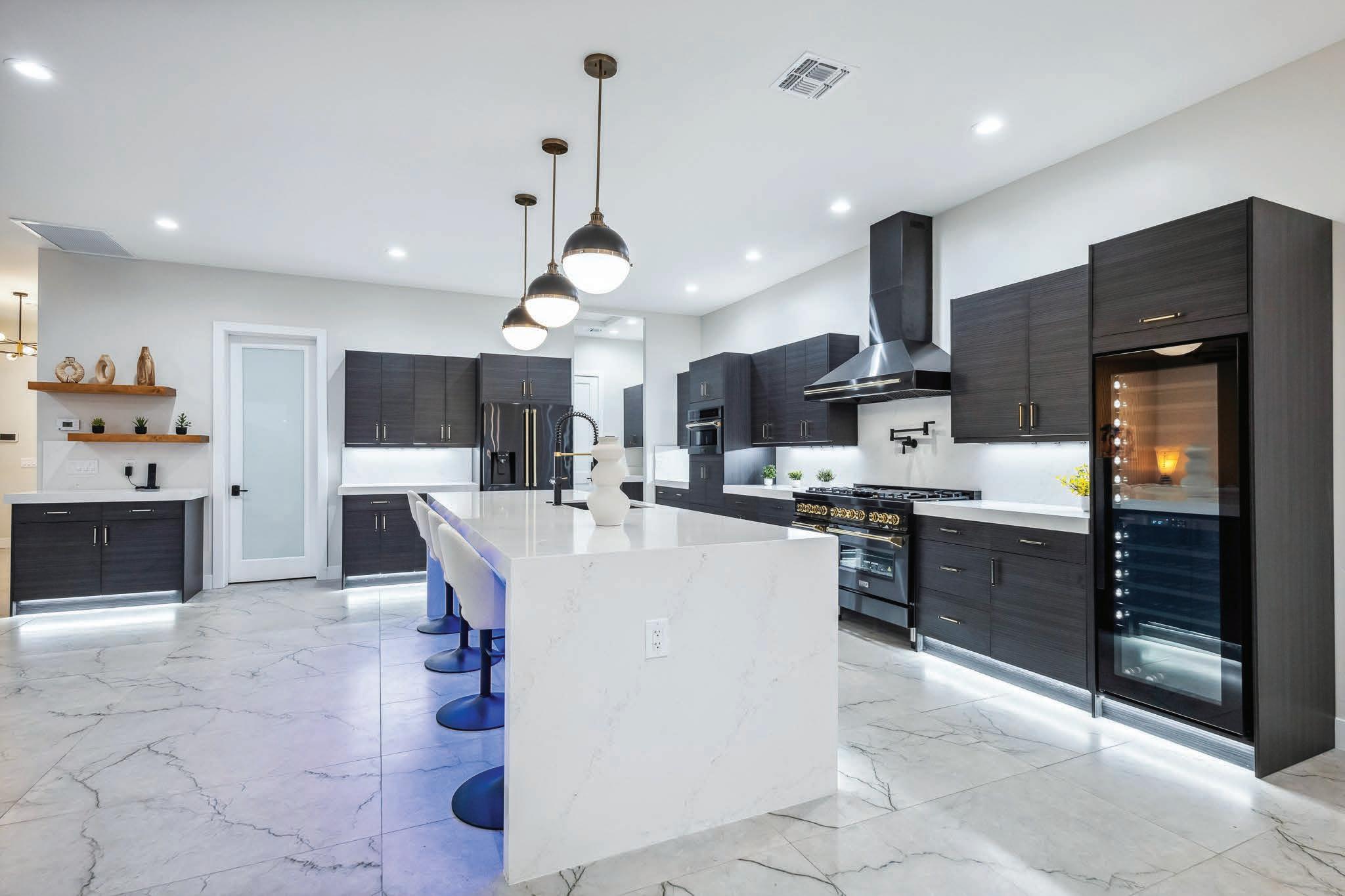The gourmet kitchen is a showstopper—anchored by a massive quartz island with waterfall edges and stylish pendant lighting. Rich, dark cabinetry offers abundant storage, perfectly contrasted by brass hardware and under-cabinet LED lighting. Premium appliances, a pot filler, a walk-in pantry, and a built-in wine fridge elevate everyday cooking to chef-level luxury.