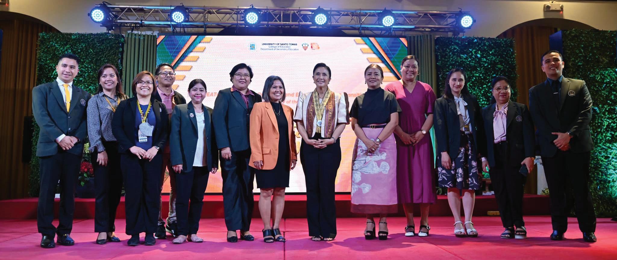 UST SHS Principal Assoc. Prof. Mary Erika N. Bolaños, Ph.D., UST Rector Very Rev. Fr. Richard G. Ang, O.P., Hon. Vilma Santos-Recto, National Artist Ricky Lee, and SHS Regent Rev. Fr. Ermito de Sagon, O.P. on April 15, 2024