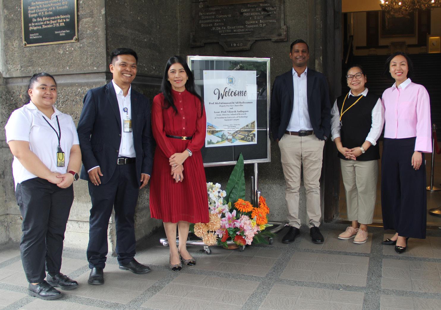 Officials from the Swinburne University of Technology Sarawak headed by their Deputy Pro-Vice Chancellor of Research Prof. Ida Fatimawati Adi Badiozaman (third from left) visited the University of Santo Tomas on February 5, 2025. Prior to their exploratory meeting at the Office of International Relations and Programs, the group was welcomed at the Main Building by TomasInno Center Assistant Manager Prof. Michael Francis D. Benjamin, Ph.D. (second from left) and UST Office of Public Affairs Director Ms. Michaella Lagniton (rightmost)
