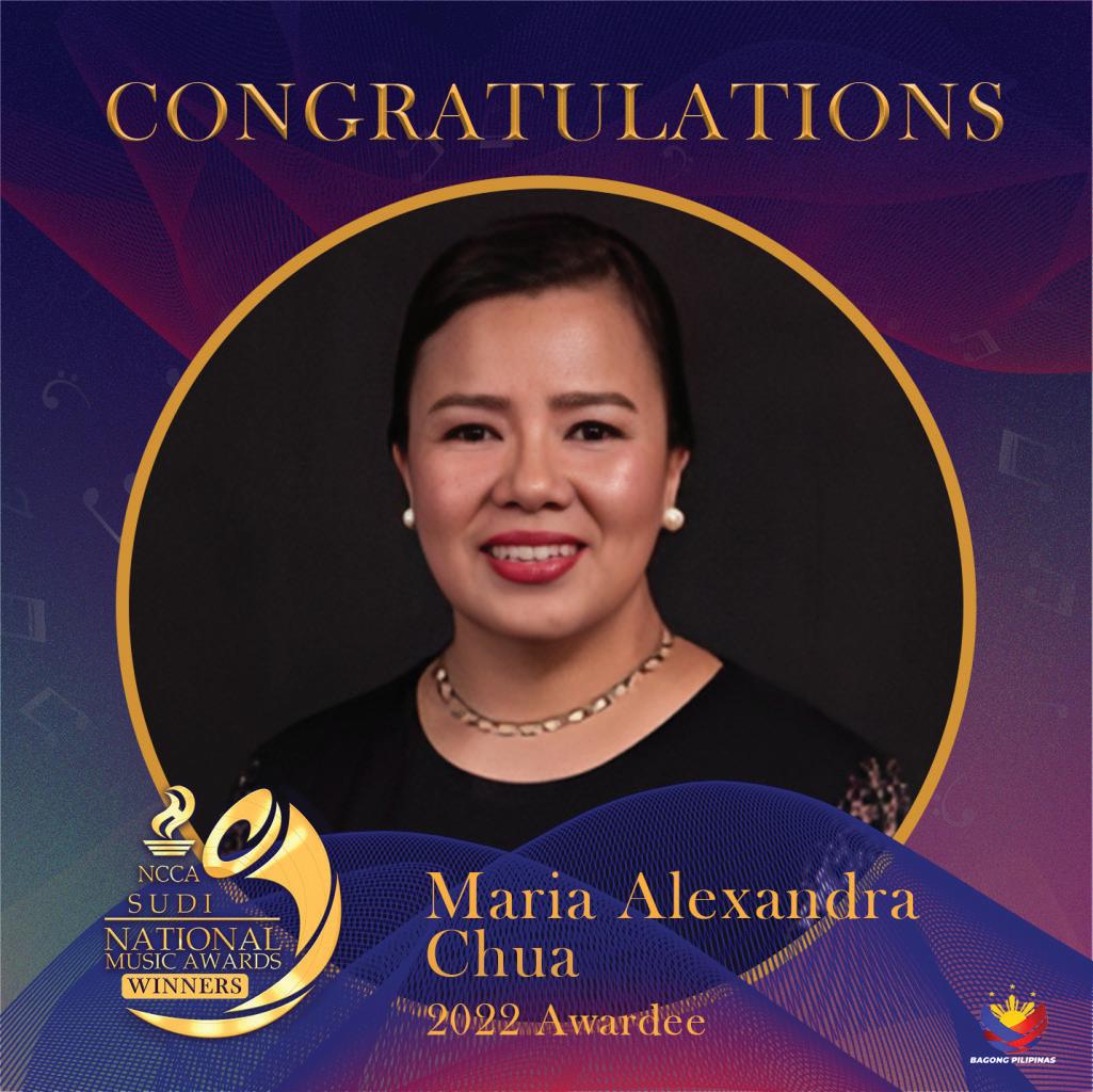 University of Santo Tomas Conservatory of Music (UST CM) Dean Prof. Alexandra I. Chua, Ph.D., and the UST Singers were recognized by the National Commission for Culture and the Arts (NCCA) during the NCCA SUDI National Music Awards on July 27, 2025, at the Metropolitan Theater.