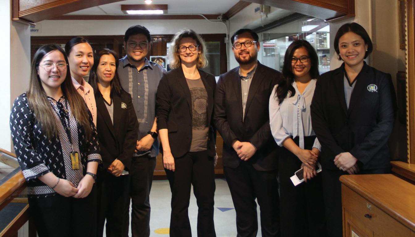 A delegation from the Austrian Embassy in Manila (@AustriaInPH), including Ms. Margit Kreuzhuber (fifth from left), Head of the Austrian Business Agency ‘WORK in AUSTRIA’, with the UST Office of Public Affairs Director Ms. Michaella Lagniton (second from left), Assistant Head Librarian for Digitization Mr. Symon Lagao (fourth from left), Assistant Head Librarian for General Reference and Information Ms. Kaori Fuchigami (rightmost) and OPA Office Assistant Ms. Shenine Pascual (leftmost) on May 14, 2024