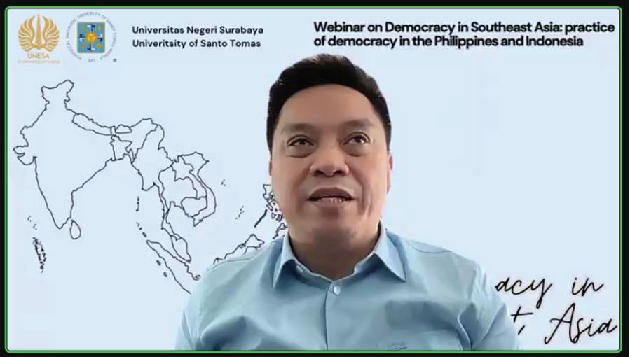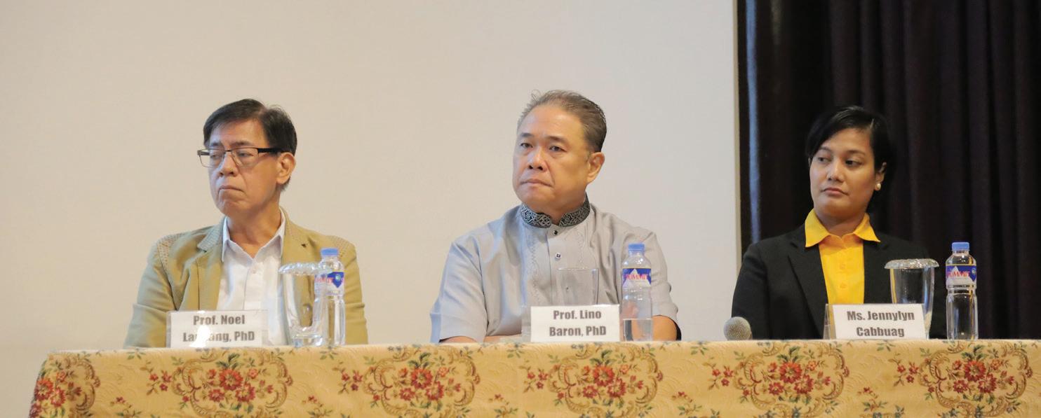 The Panel of Reactors include (from left:) USTGS Public Administration Program Lead Prof. Noel Lansang, Ph.D., USTGS Coordinator for Internationalization Prof. Lino Baron, Ph.D., and Ph.D. graduate student of the Political Science Program Ms. Jennylyn Cabbuag.
