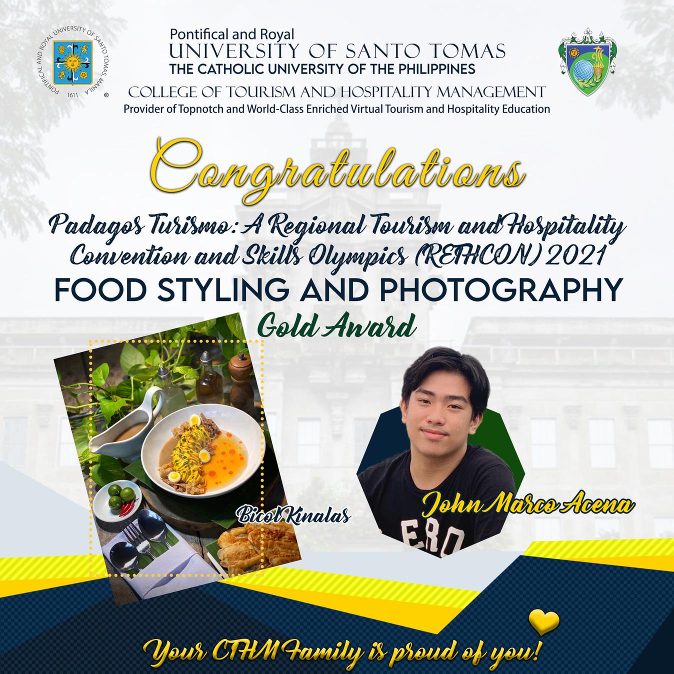 Our tourism and hospitality students received top awards during the recently concluded PADAGOS TURISMO: Regional Tourism and Hospitality Conversation and Skills Olympics (RETHCON) 2021 with the theme, “Rebuild, Redefine, Re engage” organized by TWM Production 4th Year Bachelor of Science in Hospitality Management section M1 and M4 of Universidad de Sta Isabel. Coached by Chef Danilo Bustillos, Von Marion Cabrera received a Bronze Award while John Marco Acena garnered the Gold Award for the Food Styling and Photography Category Our tourism management student, Eugene Marc R Sarimo won the Silver Award for the Travel Infographics Category