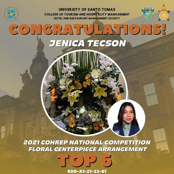 Several Hospitality Management students were awarded last December 3, 2021, during the Council of Hotel and Restaurant Educators of the Philippines (COHREP) 2021 National Virtual Skills Competition with the theme “COHREP SKILLS OF THE FUTURE: Upholding Excellence in Hospitality and Tourism” Ms Jenica Tecson, who was mentored by her coach Mr Karl Recio Baroro, ranked top 6 in the Hospitality Skills Cup Floral Center Piece Arrangement Category Meanwhile, Felice Cayaba and Diane Marie Angeles earned a spot in the top 10 for the Hotel Product Advertisement category. They were coached by Ms. Gladys Lim Martinez. Ms. Denisse Meriel Aquino also participated in the Creative Cake Display and was coached by Chef Kristian Kristoffer Roque.