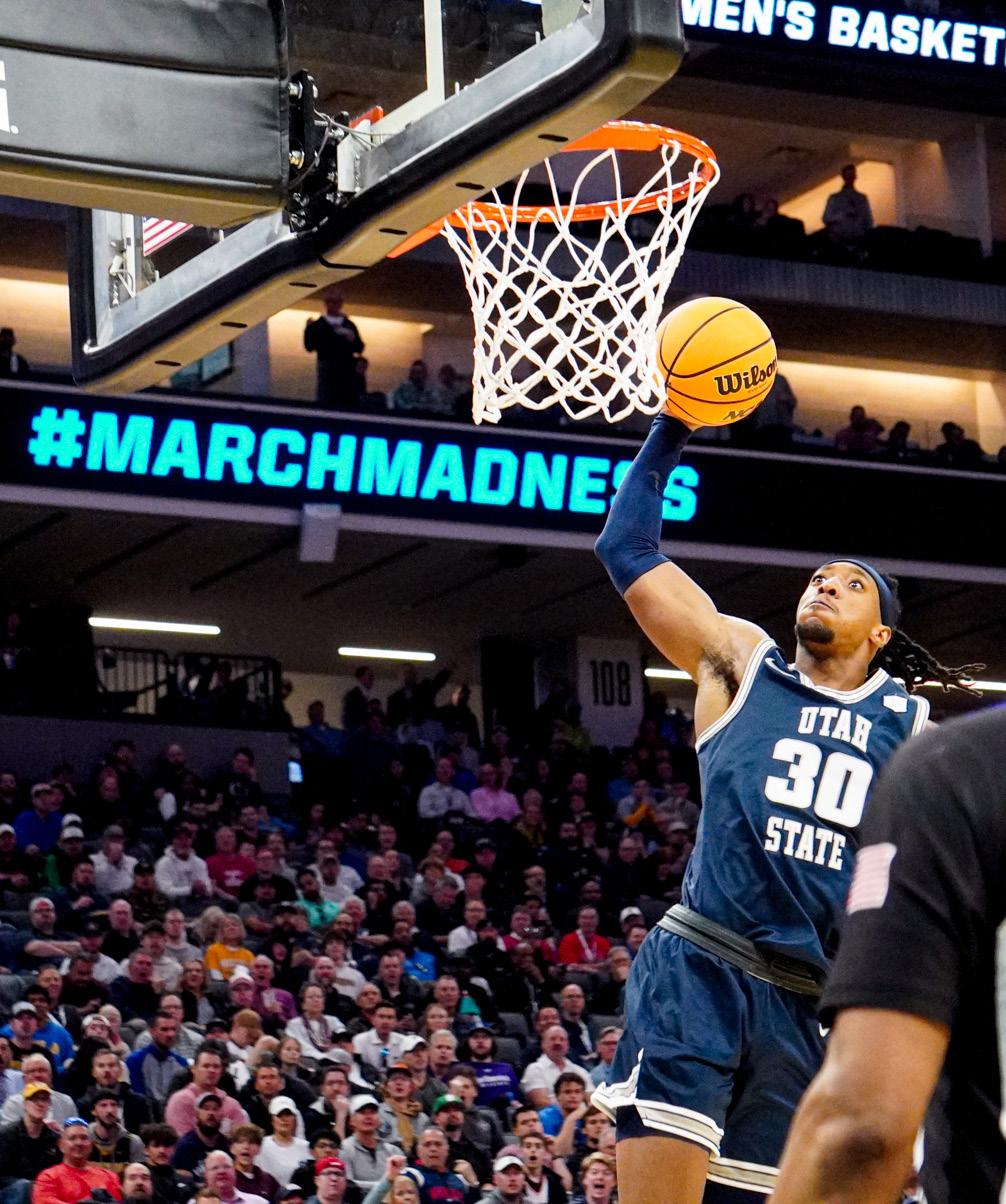 PHOTO BY Phil Weber USU forward Dan Akin goes up for a dunk during the Aggies’ NCAA Tournament game against Missouri on March 16.