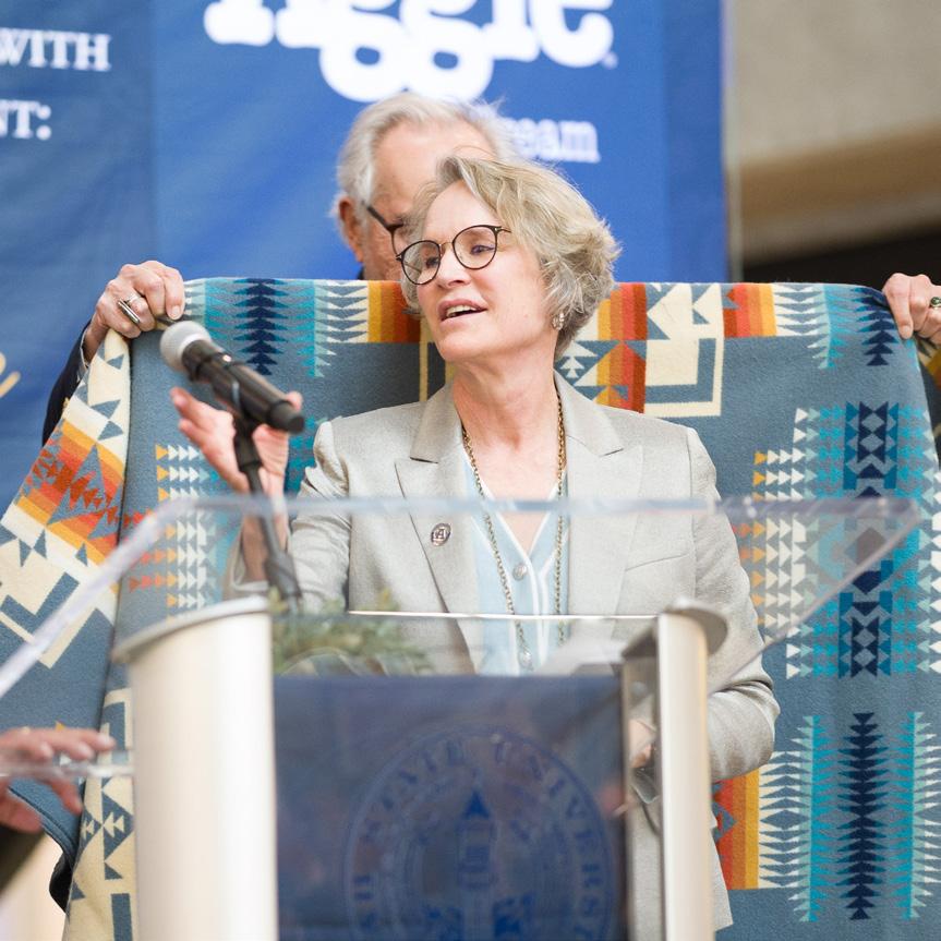 (Left) USU President Cantwell accepting a gifted blanket at the investiture.