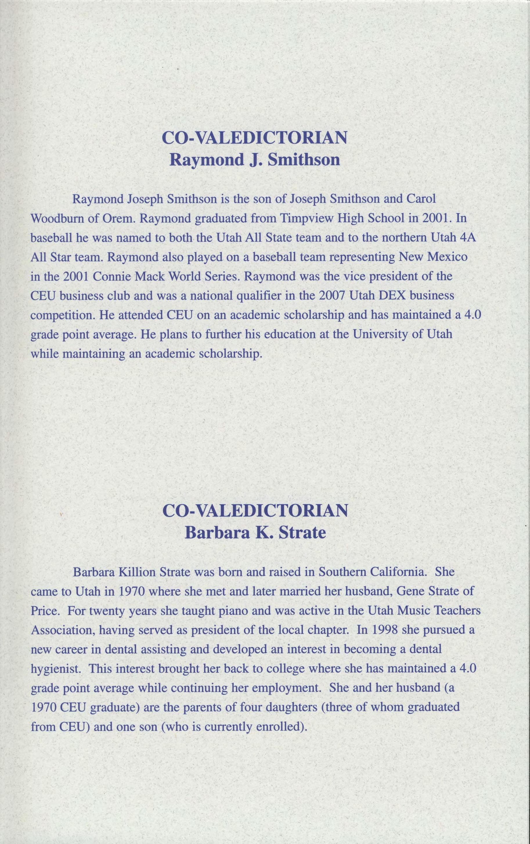 Raymond Joseph Smithson is the son of Joseph Smithson and Carol Woodburn of Orem. Raymond graduated from Timpview High School in 2001. In baseball he was named to both the Utah All State team and to the northern Utah 4A All Star team. Raymond also played on a baseball team representing New Mexico in the 2001 Connie Mack World Series. Raymond was the vice president of the CEU business club and was a national qualifier in the 2007 Utah DEX business competition. He attended CEU on an academic scholarship and has maintained a 4.0 grade point average. He plans to further his education at the University of Utah while maintaining an academic scholarship.