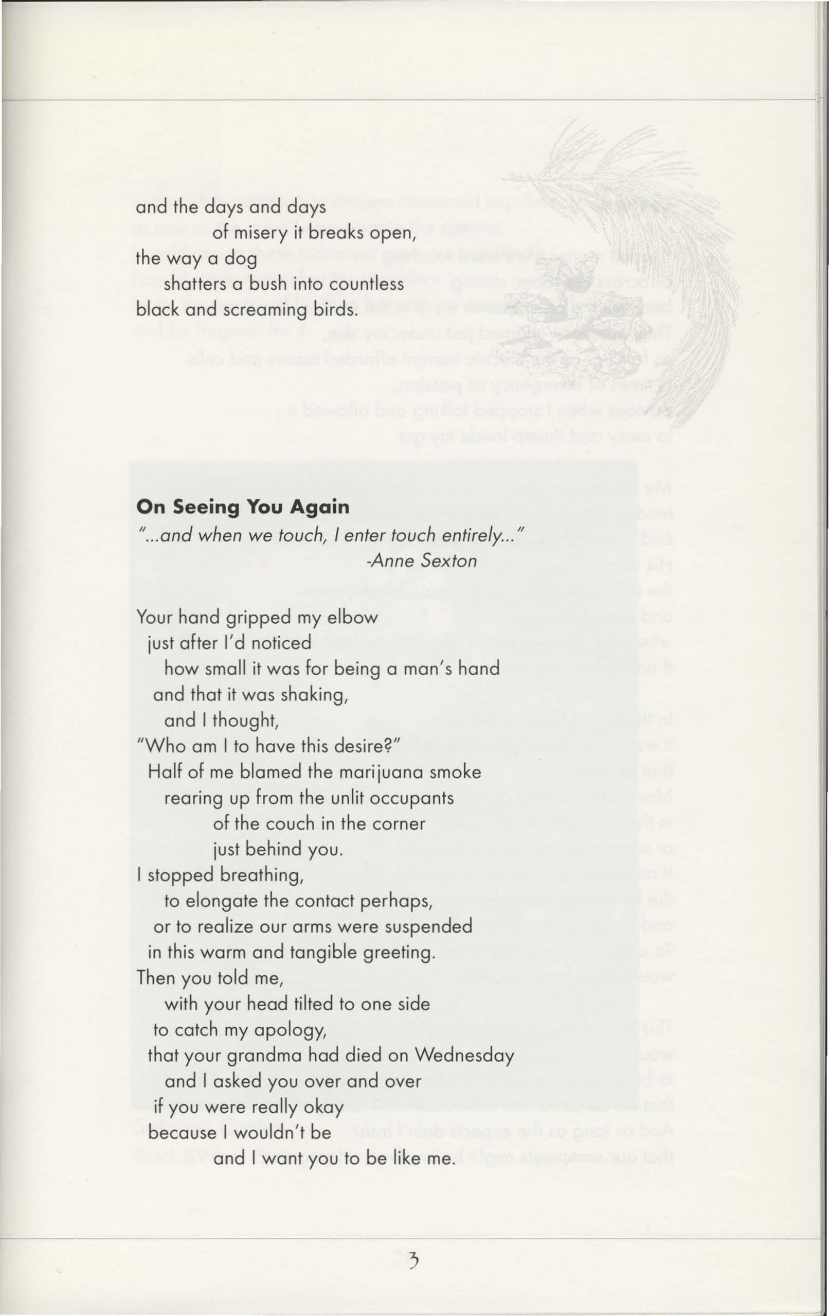 or that rituals and white dresses contained impulses as raw as the drive to propagate the species, I could assign these indiscreet gestures to instinct, I could stare, remember his shoulders, recite the poetry of longing beneath my tongue and be forgiven for it.