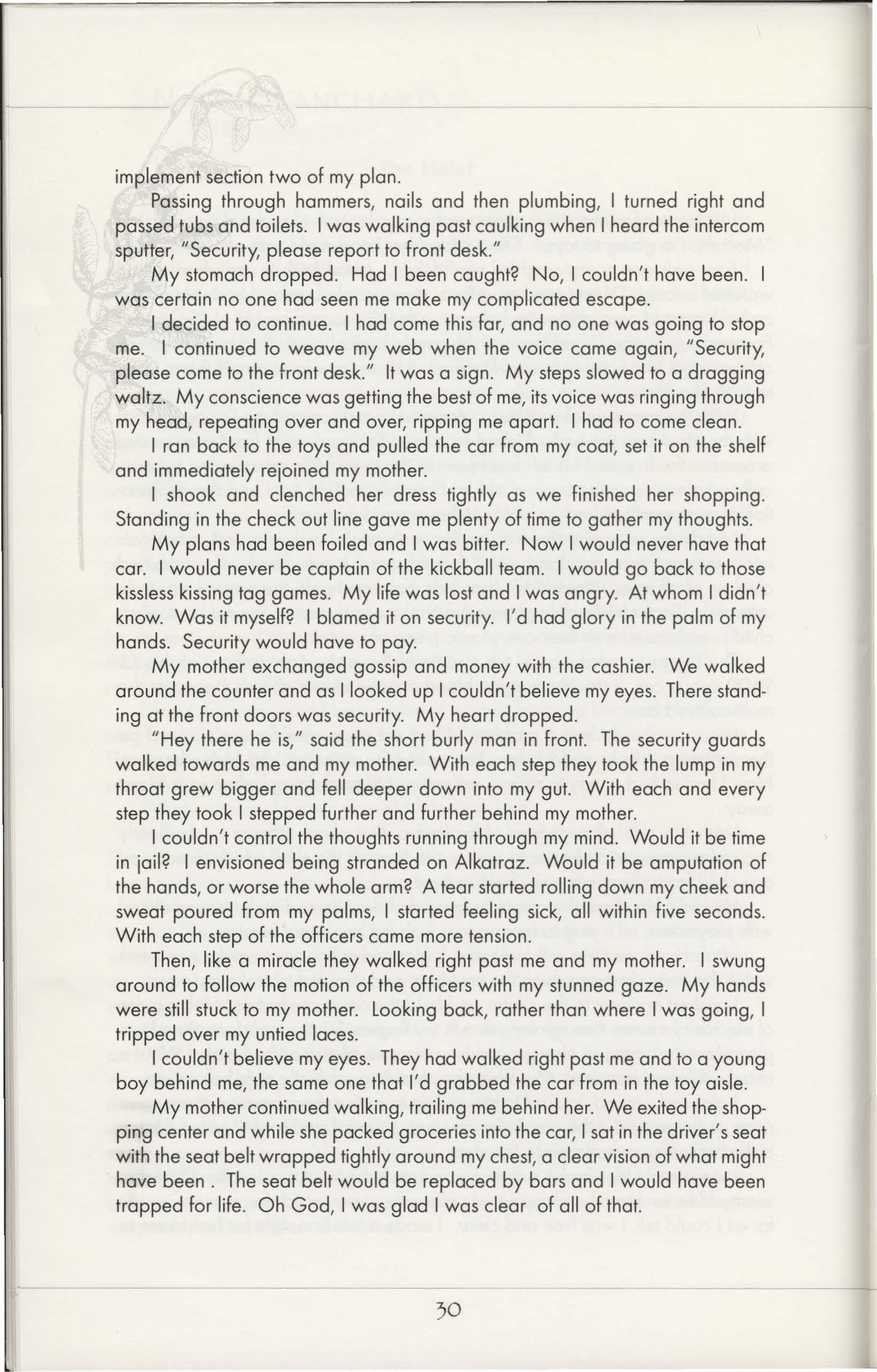 I decided to continue. I had come this far, and no one was going to stop me. I continued to weave my web when the voice came again, "Security, please come to the front desk." It was a sign. My steps slowed to a dragging waltz. My conscience was getting the best of me, its voice was ringing through my head, repeating over and over, ripping me apart. I had to come clean.