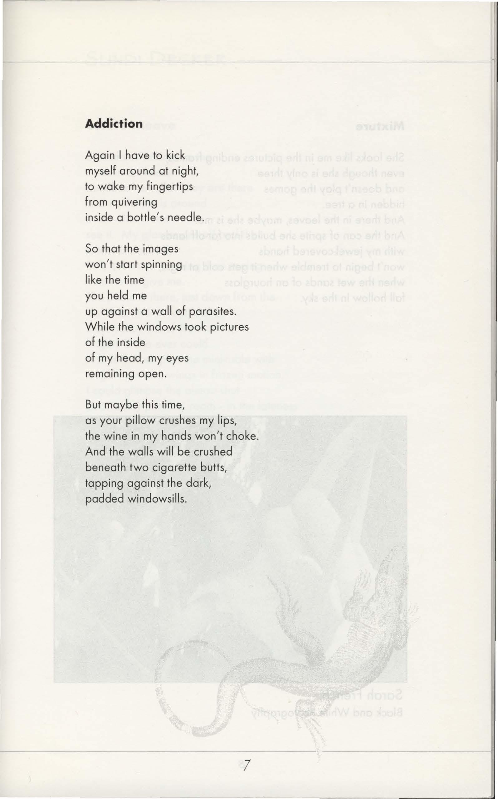 Again I have to kick myself around at night, to wake my fingertips from quivering inside a bottle's needle.