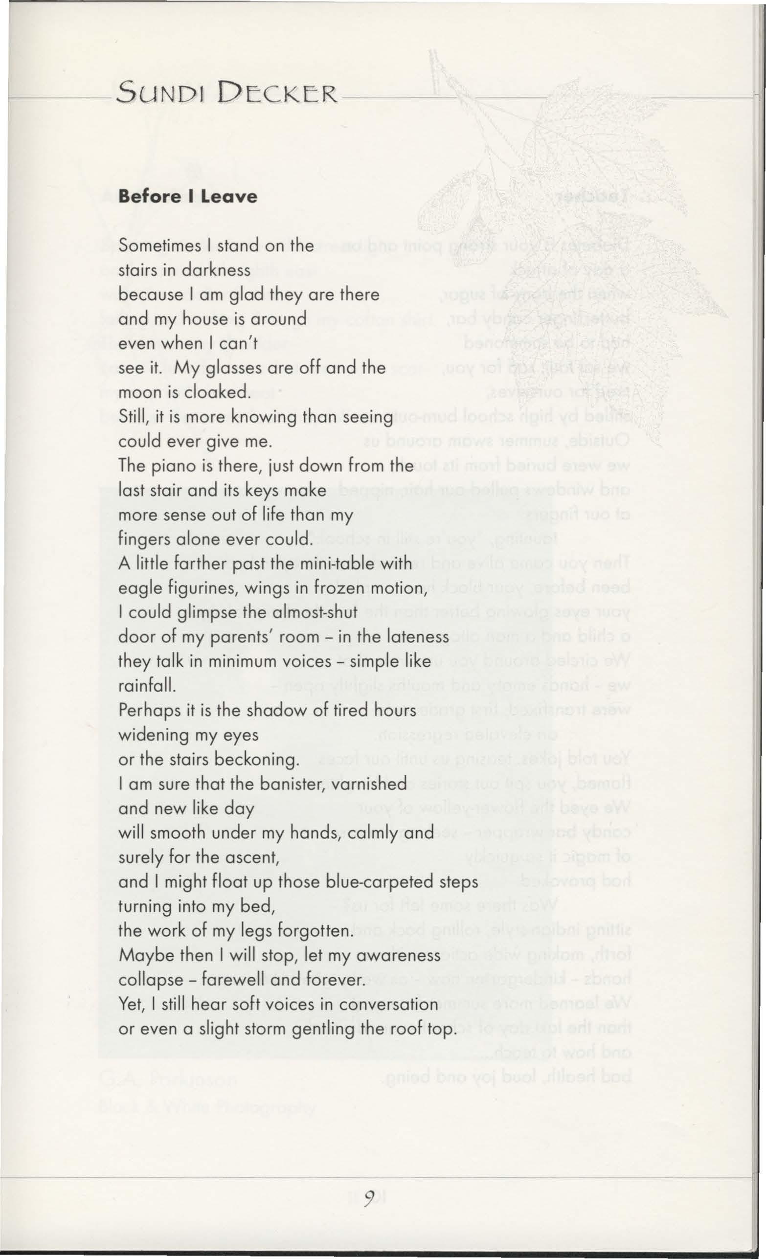 I om sure that the banister, varnished and new like day will smooth under my hands, calmly and surely for the ascent, and I might float up those blue-carpeted steps turning into my bed, the work of my legs forgotten. Maybe then I will stop, let my awareness collapse farewell and forever. Yet, I still hear soft voices in conversation or even a slight storm gentling the roof top.