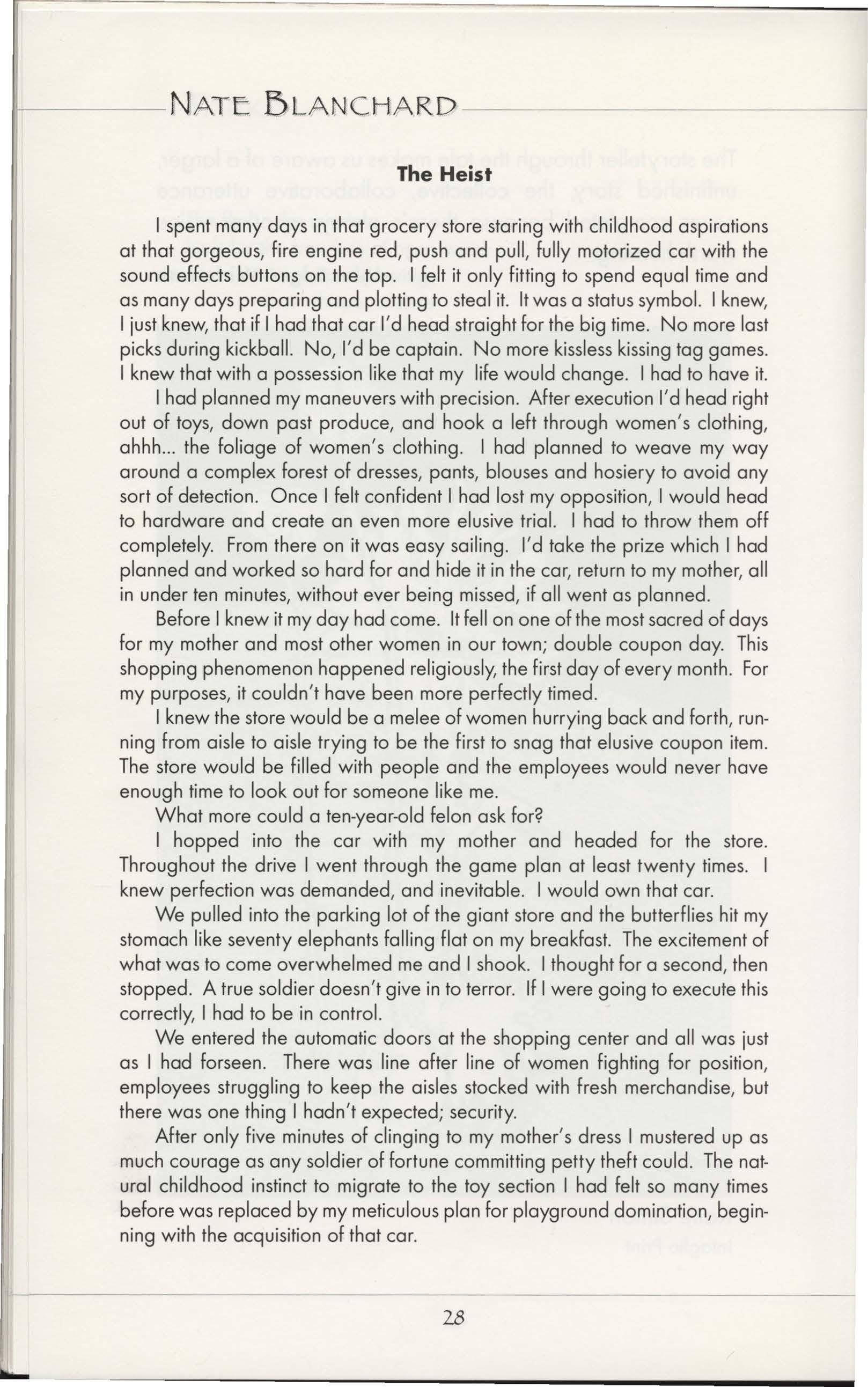 I had planned my maneuvers with precision. After execution I'd head right out of toys, down past produce, and hook a left through women's clothing, ahhh ... the foliage of women's clothing. I had planned to weave my way around a complex forest of dresses, pants, blouses and hosiery to avoid any sort of detection. Once I felt confident I had lost my opposition, I would head to hardware and create an even more elusive trial. I had to throw them off completely. From there on it was easy sailing. I'd take the prize which I had planned and worked so hard for and hide it in the car, return to my mother, all in under ten minutes, without ever being missed, if all went as planned.