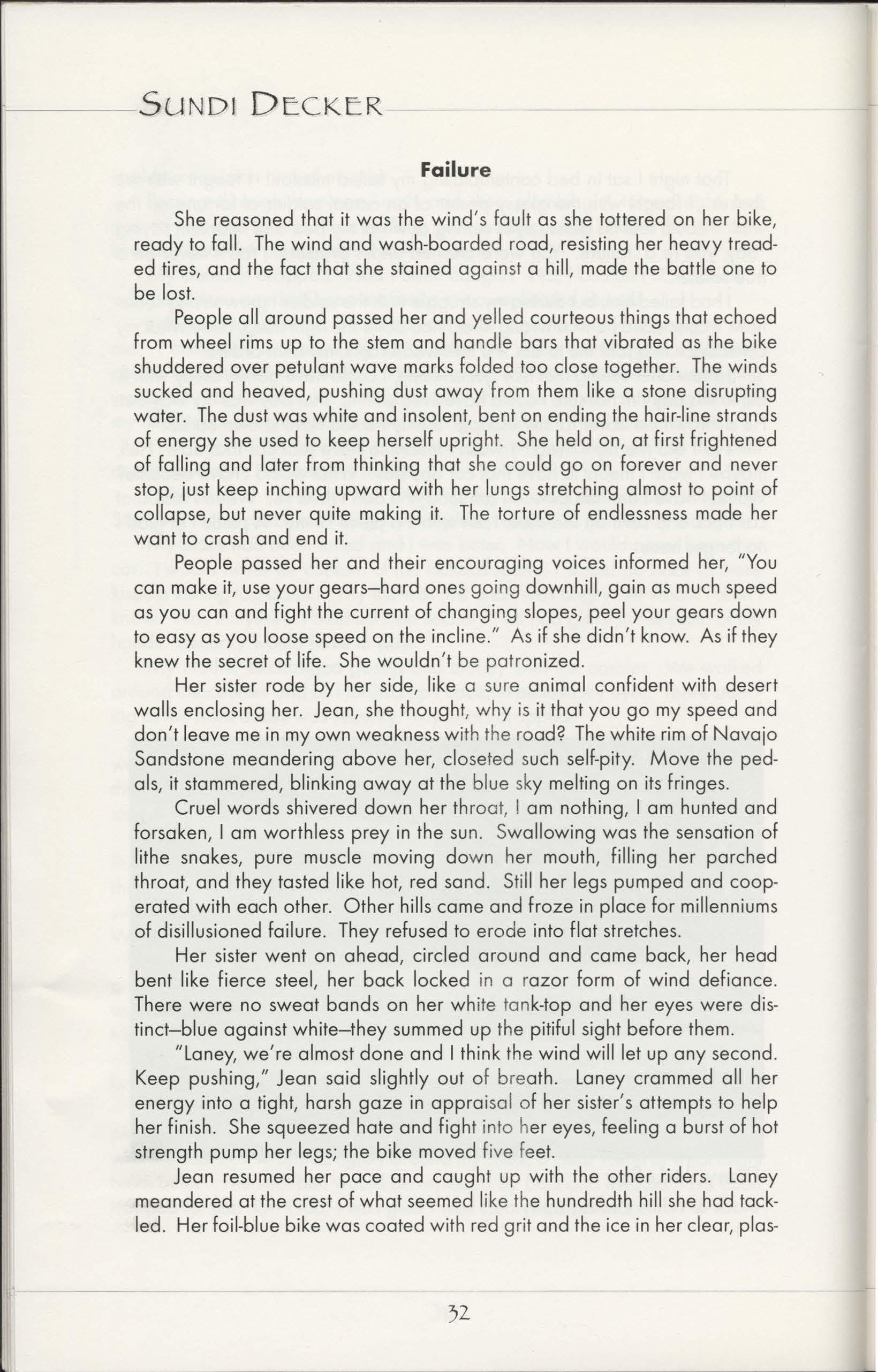 A black jeep swerved past her at a speed not meant for desert roads. Dust enfolded her and the peevish sound of the crawling automobile snapped her resistance. Easing herself from the bike, she braced her arms on its handle bars, walking to the side of it. Her feet weren't feet any longer, they had come to the point of weighing as much as mesas. Finally the top of the hill revealed itself. Rubbing her eyes repeatedly to remove little balls of dirt from their sticky, moist corners, she folded down into a kneeling position shuttling the bike away from her and letting it land on coarse sandstone. She wished the thing could be severed and left to bleed with only the eventuality of desert stars offering solace. She wondered where Jean was, probably finished by now and gulping iced Gator-aid, smiling widely in that triumphant way of hers. Moving a couple hundred feet from the hellish road, Laney stretched her legs out before her and placed a rock pillow beneath her head.