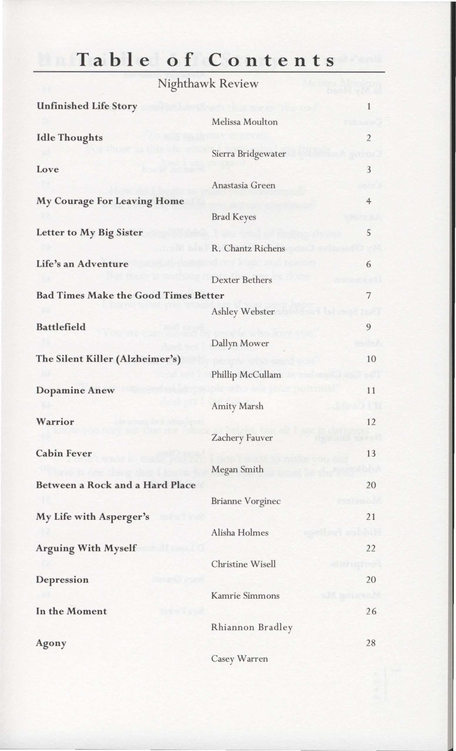 The Nighthawk Review is a literary journal dedicated to publishing the creative works of students at the USU Eastern and representing the creativity and talent of the student body. All genres of creative writing are to be represented within these pages and all writers-so long as they are USU Eastern students-are invited and encouraged to submit work. All work is to be chosen from an editorial board of student editors and, while there will be faculty supervision, the content of the journal will be chosen by the student editors to ensure that this publication is created by the student population for the student population.