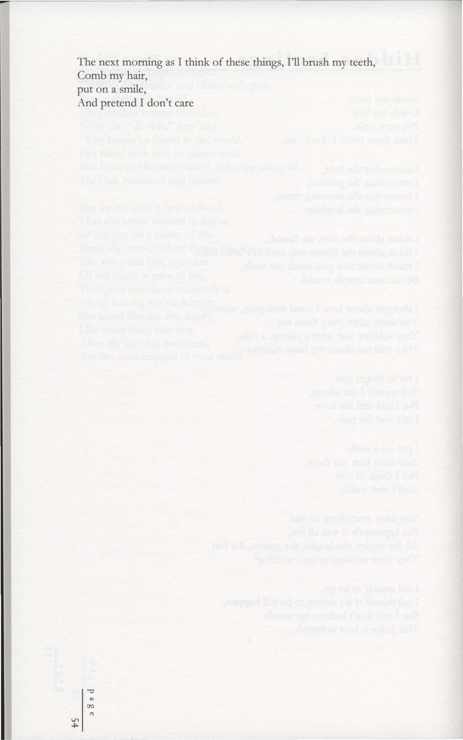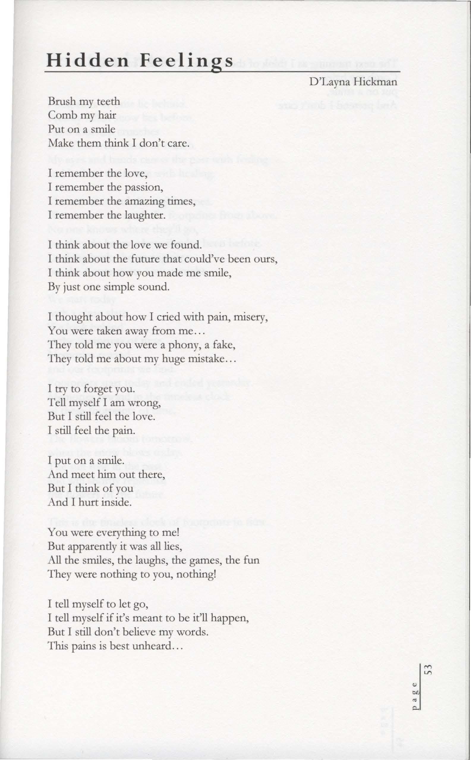 D'Layna HickmanThe next morning as I think of these things, I'll brush my teeth, Comb my hair, put on a smile, And pretend I don't care
