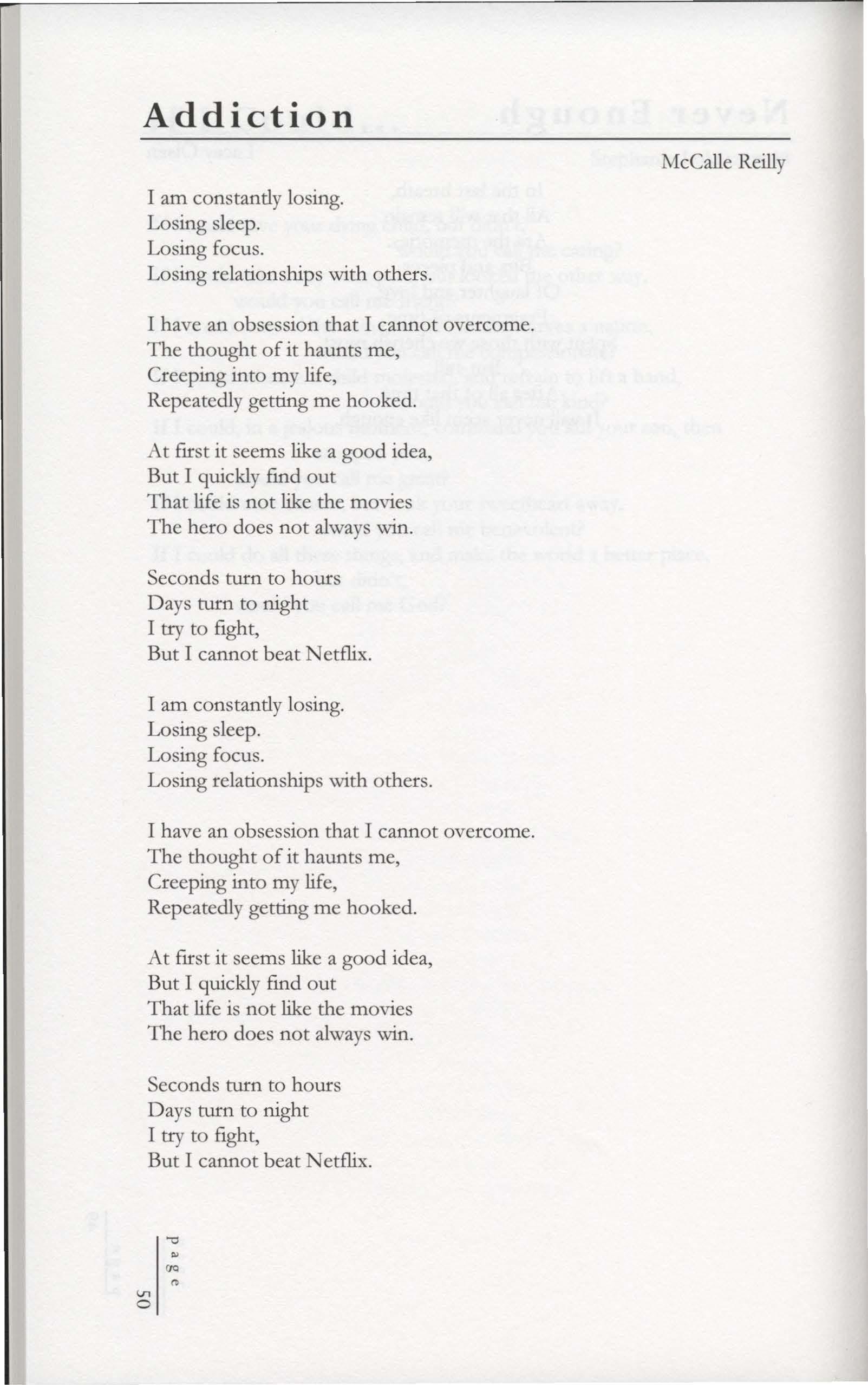 I have an obsession that I cannot overcome. The thought of it haunts me, Creeping into my life, Repeatedly getting me hooked.