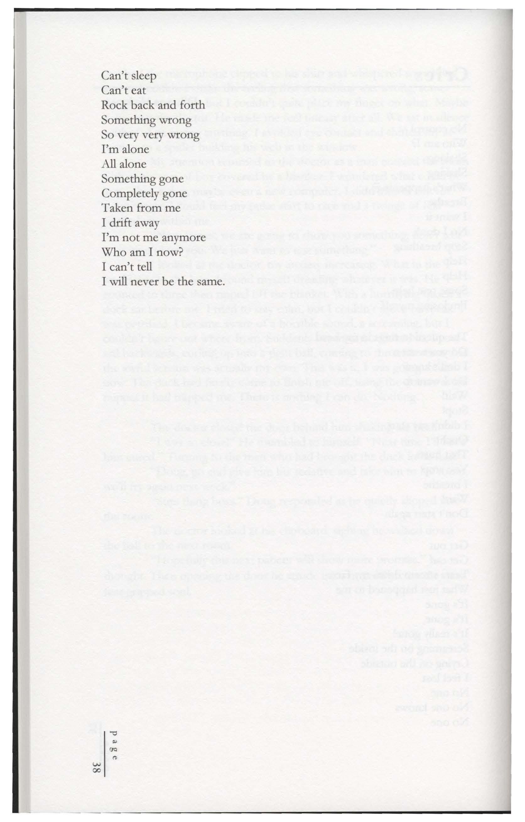 They couldn't come from her, "You can't do this," they said, "You haven't a friend in the world." Her mind sank into an empty void, Her body in blankets curled, believing every lie, That her monsters had hurled.