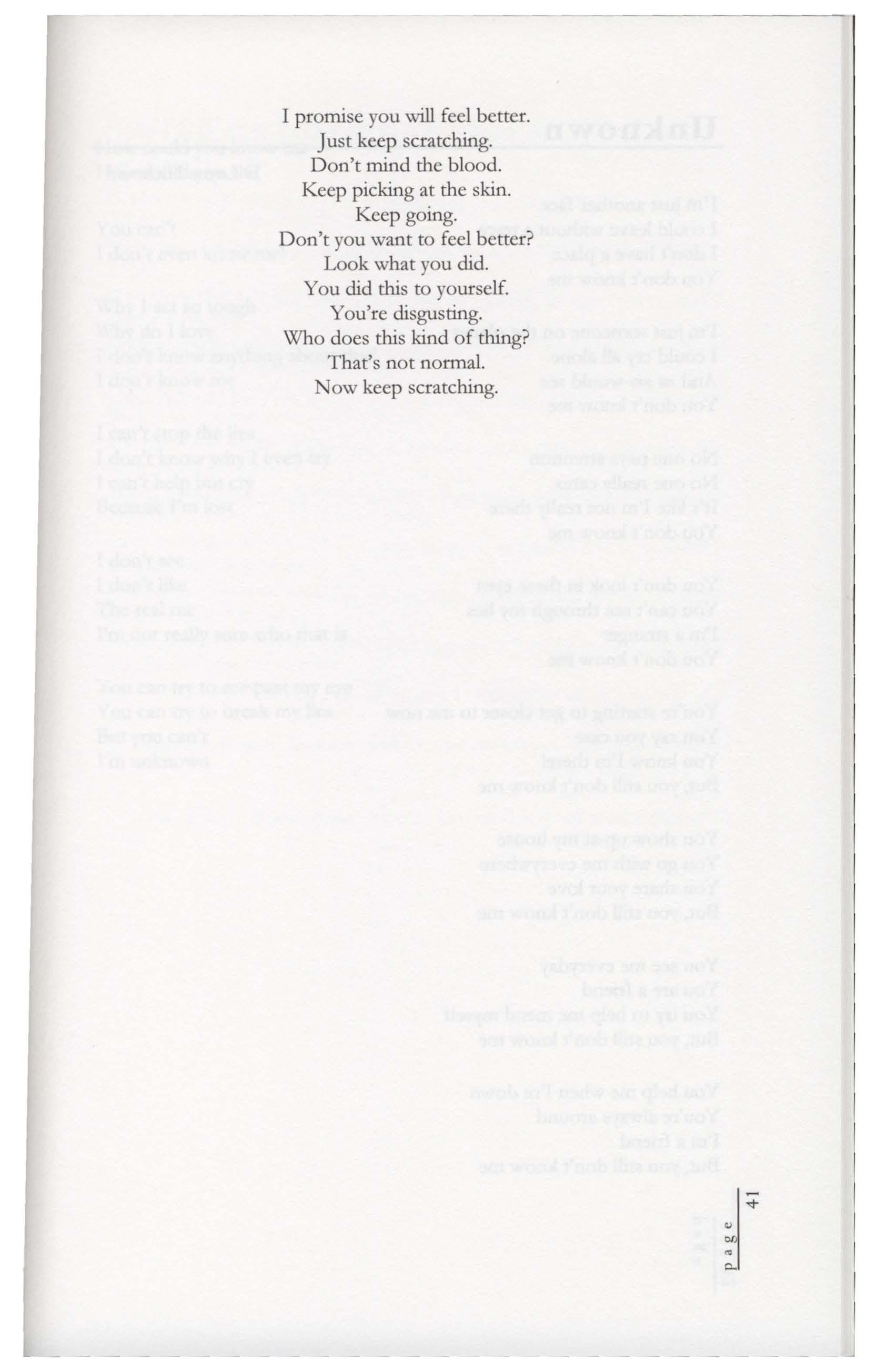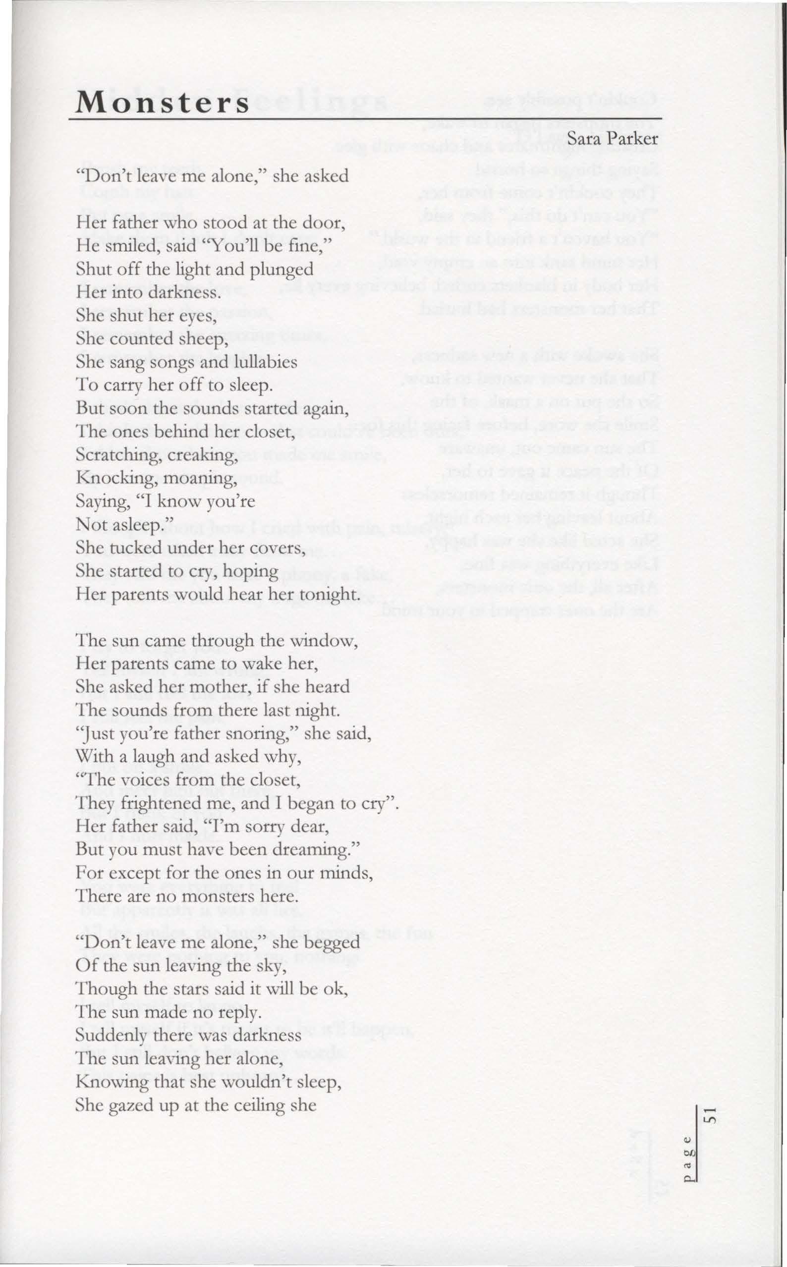 But soon the sounds started again, The ones behind her closet, Scratching, creaking, Knocking, moaning, Saying, "I know you're Not asleep."