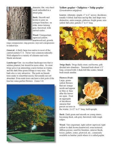 Twigs/Buds: Twigs fairly stout; red-brown; pith divided into chambers. Terminal buds about 1/2” long, covered with 2 duck-bill like scales; lateral buds much smaller. Flowers/Fruit: Large, greenyellow flowers that are orange inside and appear in May or June after the leaves are open. Fruit an aggregate of deciduous samaras that persist on trees in the winter; 2-1/2” to 3” long; held upright. Bark: Dark green and smooth on young stems; becoming thick, ash-gray, furrowed, with rough ridges. Wood: Very important; light yellow sapwood; light yellow to dark brown heartwood; even-textured; diffuse-porous; used for furniture, interior finish, boxes, pallets, crates, plywood, etc.; commonly available in lumber yards where it is called poplar.