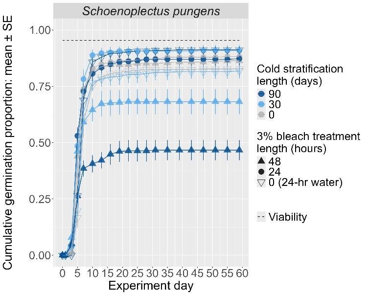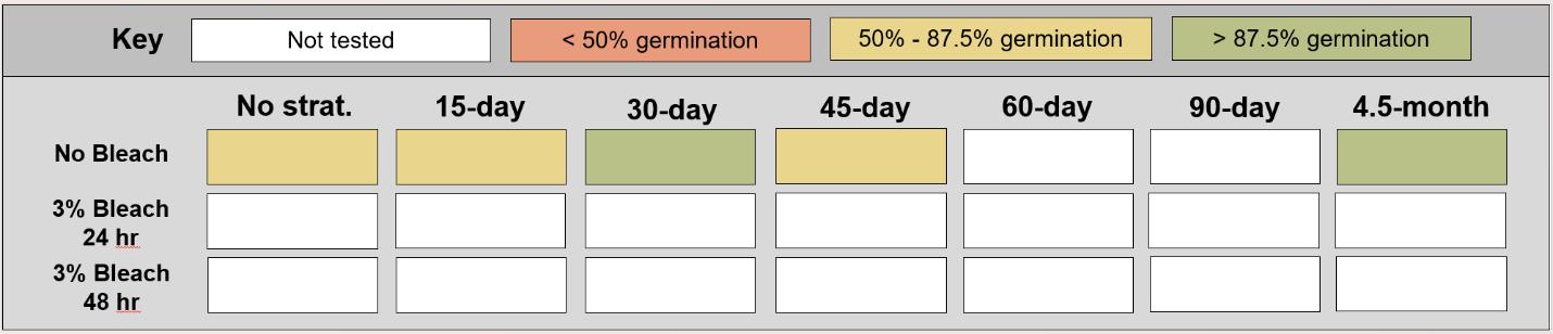 Notes: The alternative will yield slightly lower germination (5% lower) at a similar speed but could be acceptable if there is a short timeline for dormancy break. Seeds that experienced no bleach treatment had lower germination. No treatments reached above 75% germination. Further research is needed to optimize dormancy break methods.