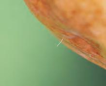 • About 0.02 inches (0.6 mm) long and 0.007 inches (0.18 mm) wide. • White to creamy translucent; cylindrical in shape. • Two thin respiratory filaments occur on one end (Figs. 3.6-3.8). • Filaments may protrude from fruits with eggs (Figs. 3.9-3.10).