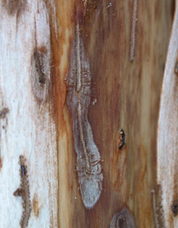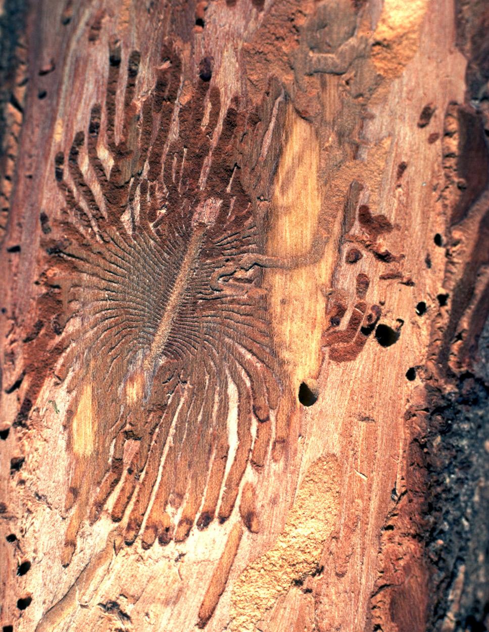 Freshly made European elm bark beetle gallery with staining from Dutch elm disease visible around it.