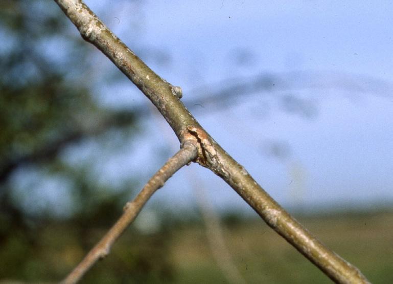 Feeding injury on twigs caused by European elm bark beetle. The Dutch elm disease pathogen can be introduced into the tree through such wounds. Joseph