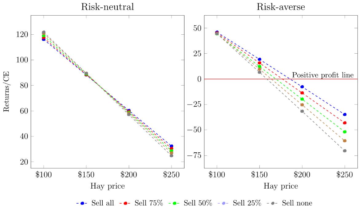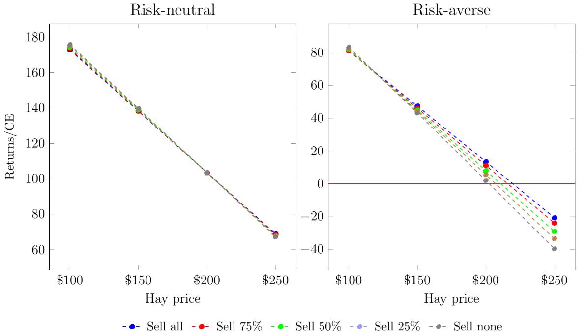 Notes Hay prices are $/ton. CE is certainty equivalent. Per Table 1, “Sell all” is Scenario 1, “Sell 75%” is Scenario 2, “Sell 50%” is Scenario 3, “Sell 25%” is Scenario 4, and “Sell none” is Scenario 5