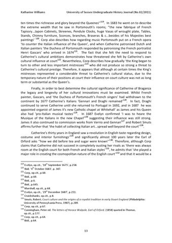 Evelyn, op.cit., ‘10th September 1675’, p.258. Ibid. ‘4th October 1683’, p. 307. 121 Corp, op.cit., p.60. 122 Ibid., p.60. 123 Ibid., p.6. 124 Ibid., p.645. 125 Marshall, op.cit., p.68. 126 Evelyn, op.cit., ‘29th December 1687’, p.251. 127 Cruickshanks, op.cit., p.8. 128 Smuts, Robert, Court culture and the origins of a royalist tradition in early Stuart England (Philadelphia: University of Pennsylvania Press, 1987), p.289. 129 Corp, op.cit., p.67. 130 Cunningham, Peter ed. The letters of Horace Walpole, Earl of Orford, (1858) quoted in Thomas, op.cit., p.177. 131 Corp, op.cit., p.64. 132 Ibid., p.64. 120