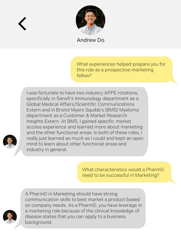 Currently, Andrew Do is a fourth-year student pharmacist at the University of Texas at Austin College of Pharmacy and will be joining Alnylam Pharmaceuticals as a United States Marketing fellow upon graduating this May 2023. His other experiences include industry rotations at Bristol Myers Squibb and Sanofi, a clinical internship at The Johns Hopkins Hospital in pediatric inpatient pharmacy, and published research in the Journal of the American Pharmacists Association.