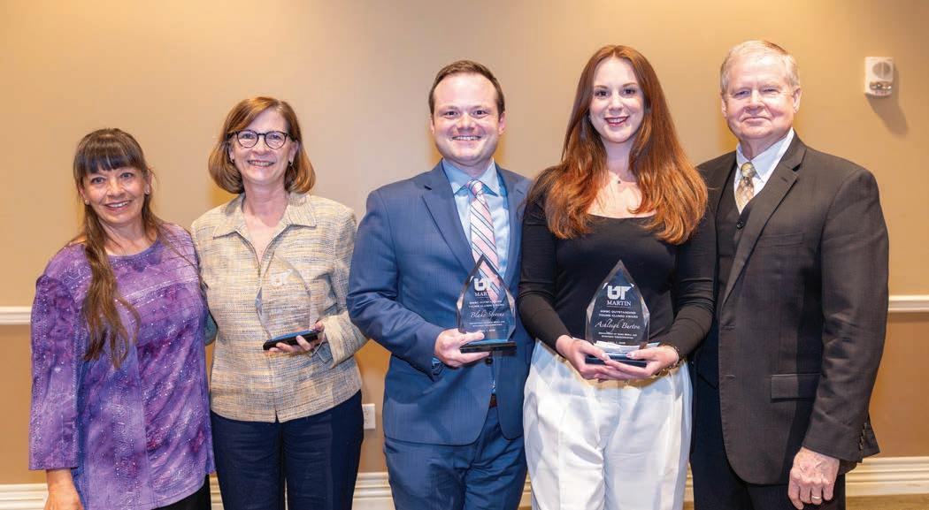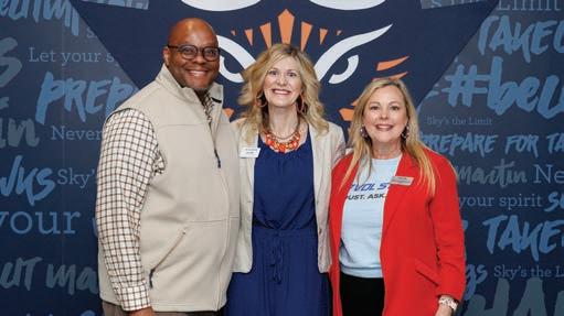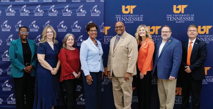 UT Martin’s sixth regional center, located in Springfield, received official approval in February from the Southern Association of Colleges and Schools Commission on Colleges (SACSCOC). The center, housed on the Volunteer State Community College-Springfield campus, was made possible through a strong partnership with Vol State and offers bachelor’s degrees in agricultural business, farm and ranch management, and interdisciplinary studies. The center also supports a growing dual-enrollment program with Robertson County Schools, allowing students to complete a fouryear UT Martin degree without leaving the region. Leaders from both institutions emphasized the center’s impact on educational access and workforce development. Pictured above are UT Martin Chancellor Yancy Freeman; Erica Bell ('96, '12), executive director, Office of Regional Centers and Online Programs; and Dr. Wendi Tostenson, Volunteer State president.